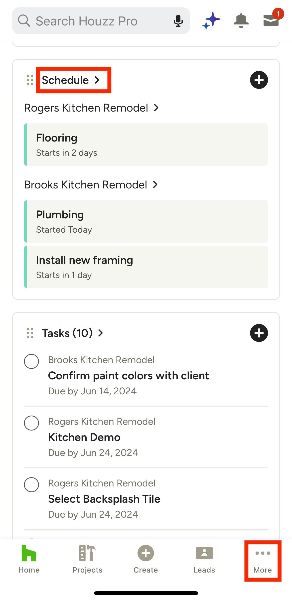 When you use Schedule on your Houzz Pro mobile app, you can review all your project timelines and ensure that everything stays on track. You can view and edit an existing schedule, create a new schedule, create new items, assign clients or team members, create tasks and view a big-picture schedule overview of all your projects.