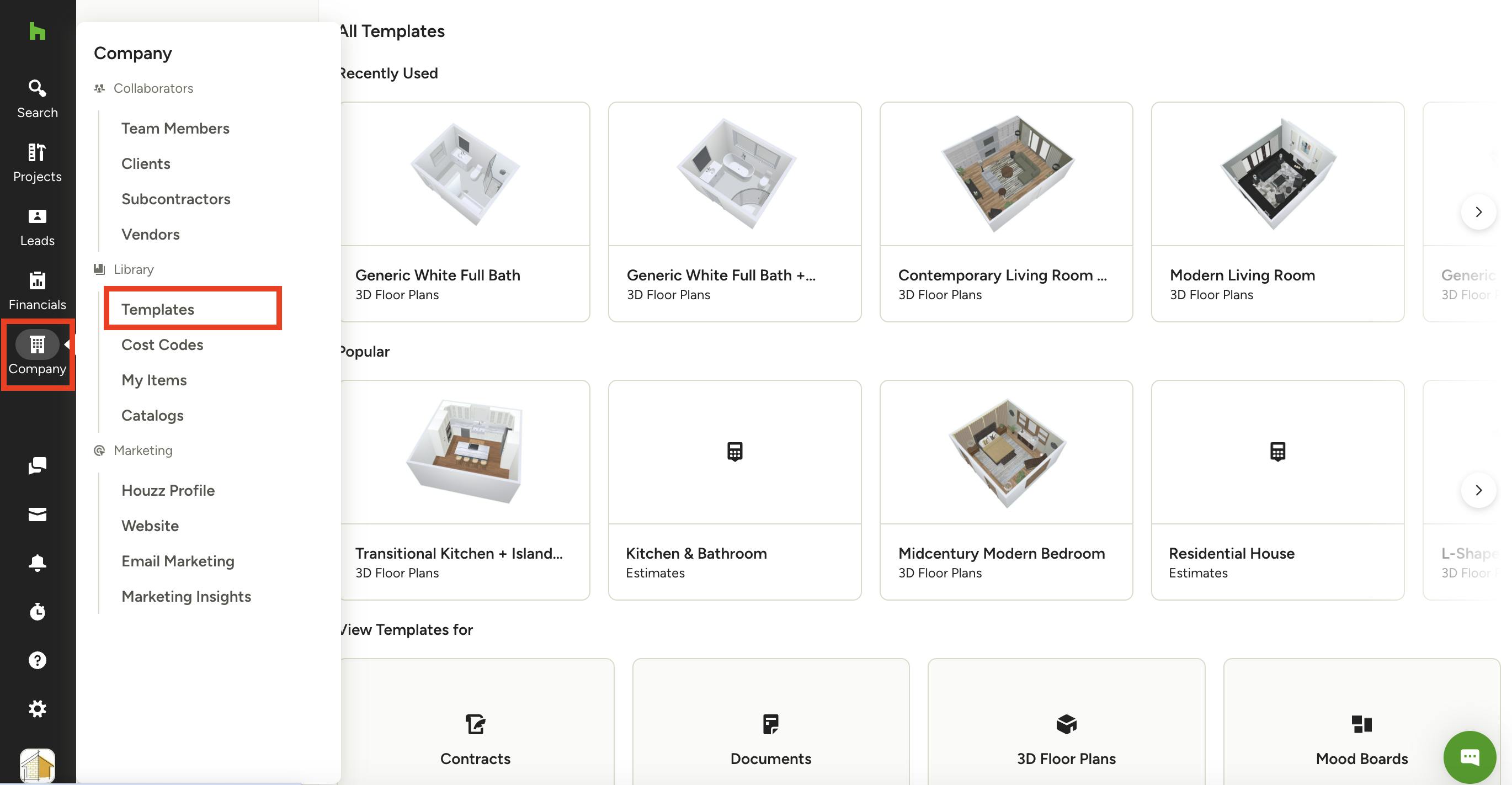The Houzz Pro preset templates will be listed at the top. Click one of templates to open and view template details. From here, you can also apply the template to a new or existing project or lead.