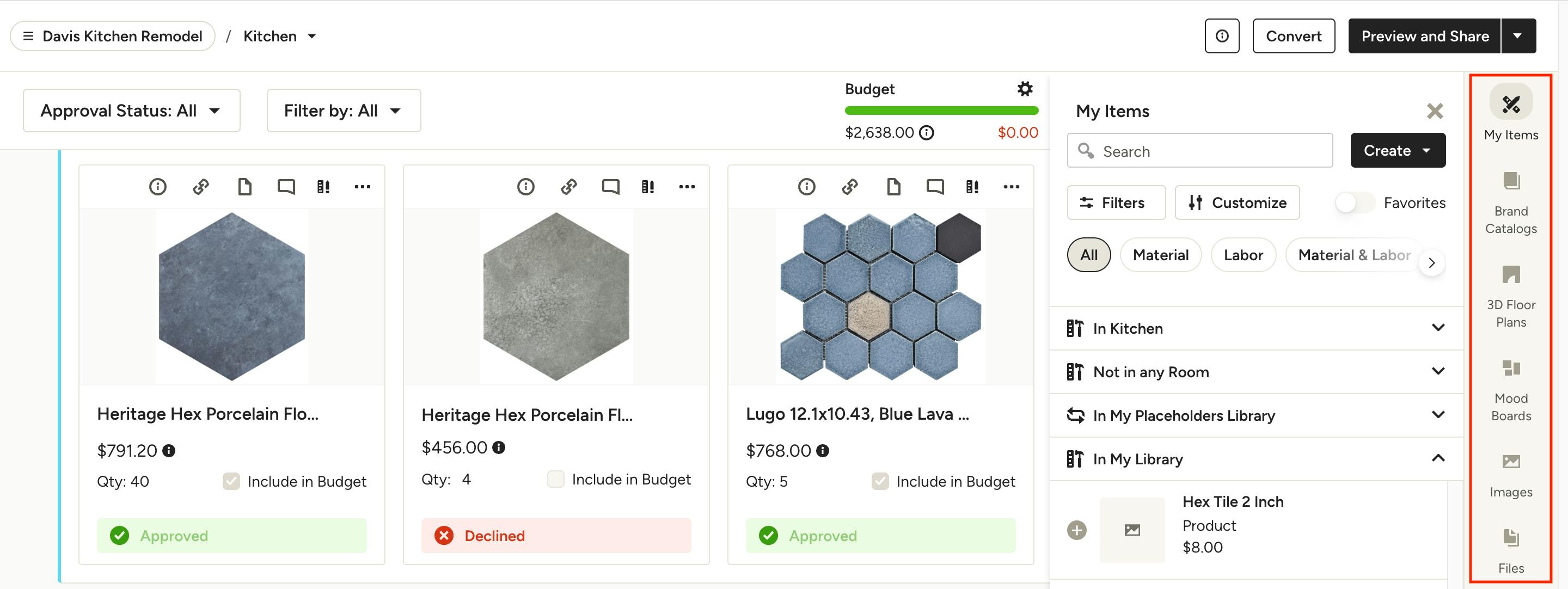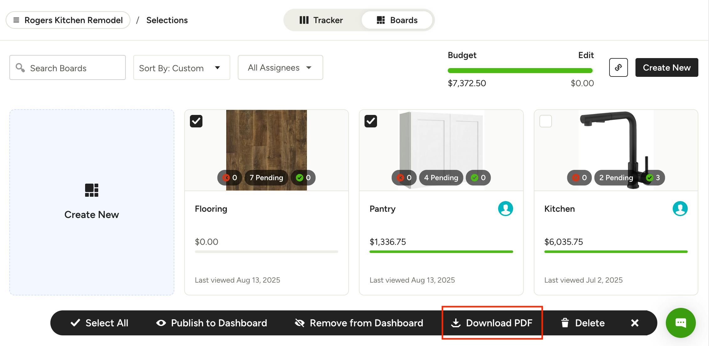 Your selection boards can pull in your clipped products, materials, finishes, fixtures, appliances, mood boards, 3D floor plans, and files in an organized way to present to your client.