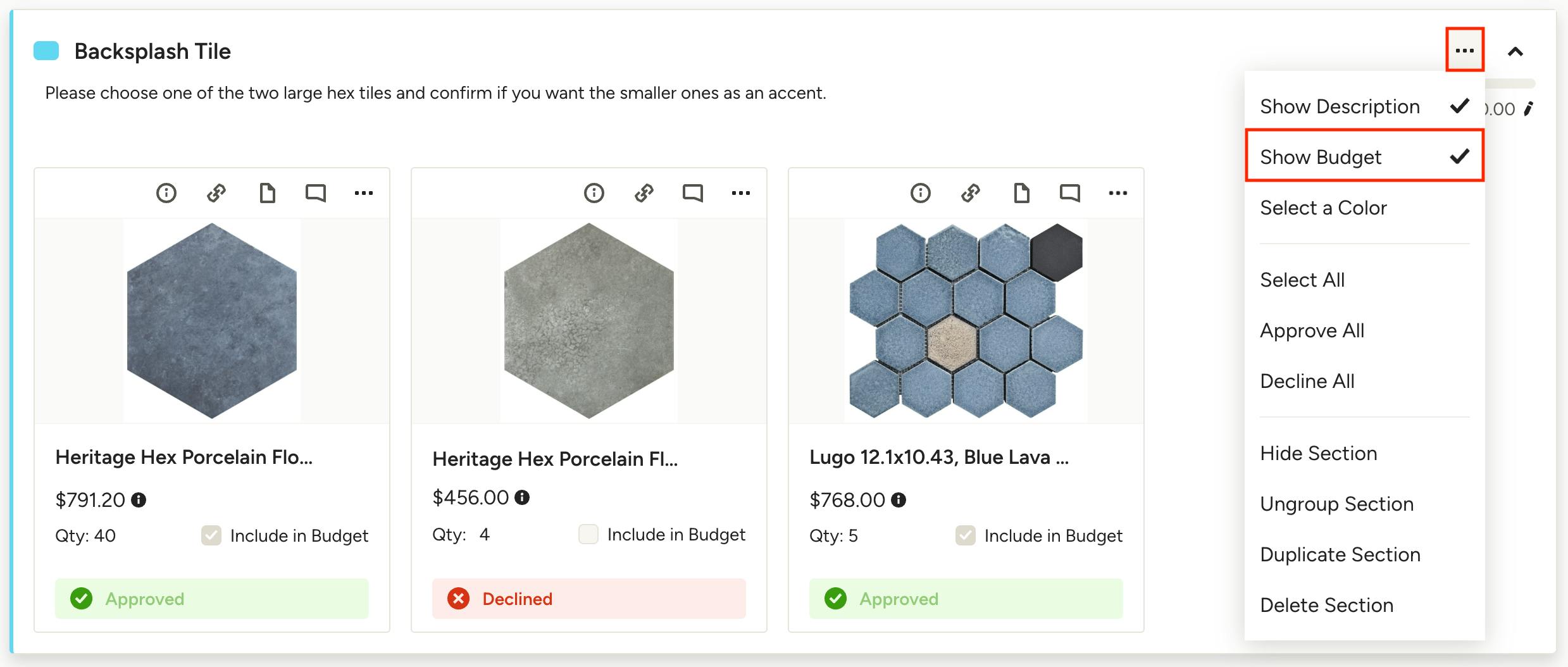 You can set budgets for each section within your board, allowing you and your client a clearer view of how the overall budget is allocated across different product categories. To set a section budget, you first need to use the three dots menu on a section to make sure Show Budget is enabled.