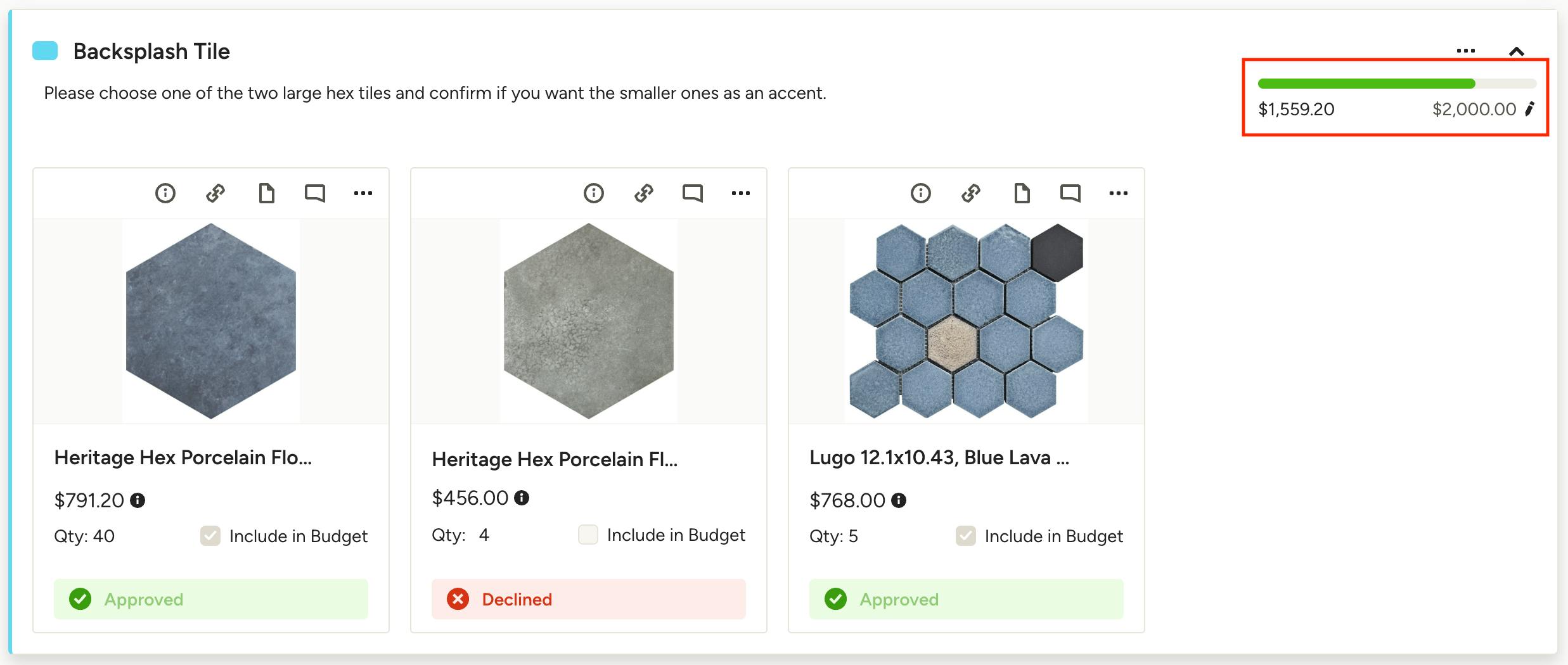 Manage budget expectations with ease. In the upper right corner of each selections board, you’ll see a budget bar. Just click Edit to add in the room’s budget and select whether taxes and shipping costs are included in the total. As items are approved, the budget bar fills in accordingly. Clicking on the Information icon will show you the detailed breakdown of your budget; this detail is only visible to you, not the client.