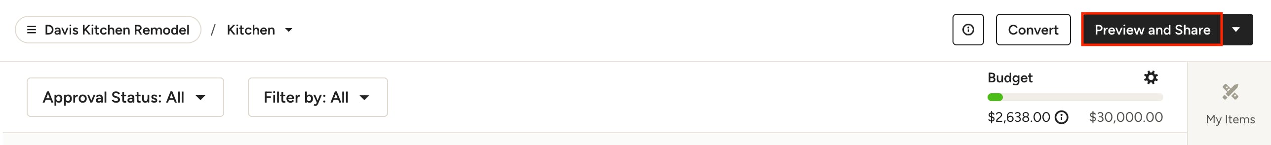 When you're ready to move forward with the client's selections, simply click the Convert button on the top right to turn the selections board into a professional estimate or invoice. You'll be able to select exactly which items to include on the document and the see the total for the items selected.