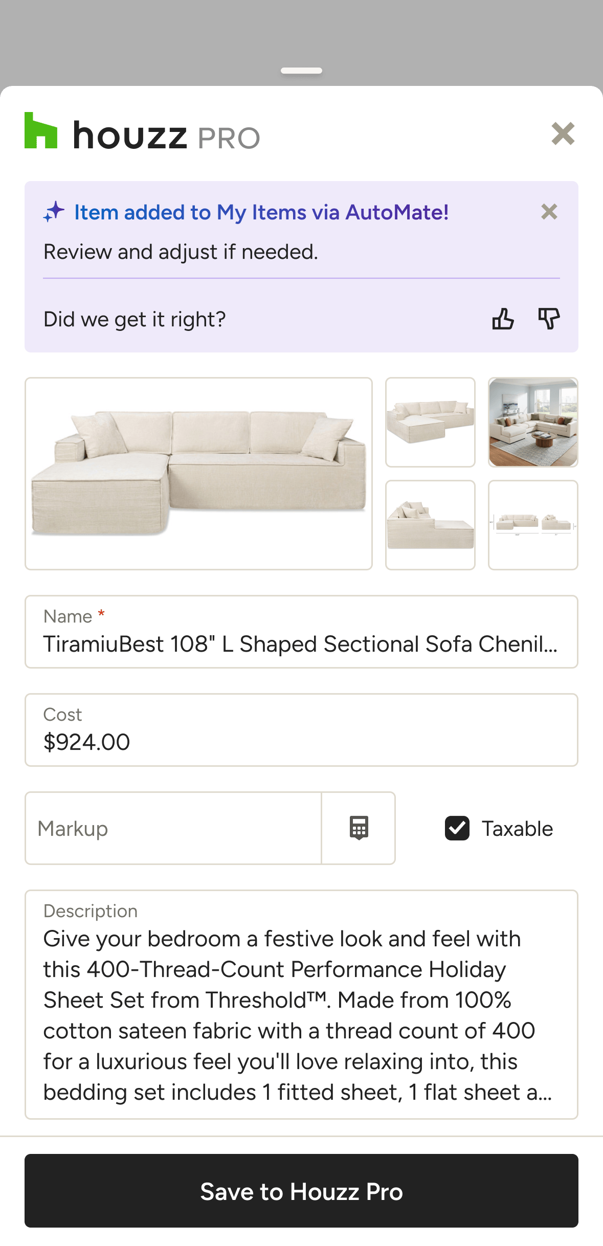 When all of the relevant information is filled in, tap Save to Houzz Pro. The item will be added to your My Items library, which you can access in the Houzz Pro app or desktop experience, and you will be directed back to the website you were browsing so you can continue sourcing items.