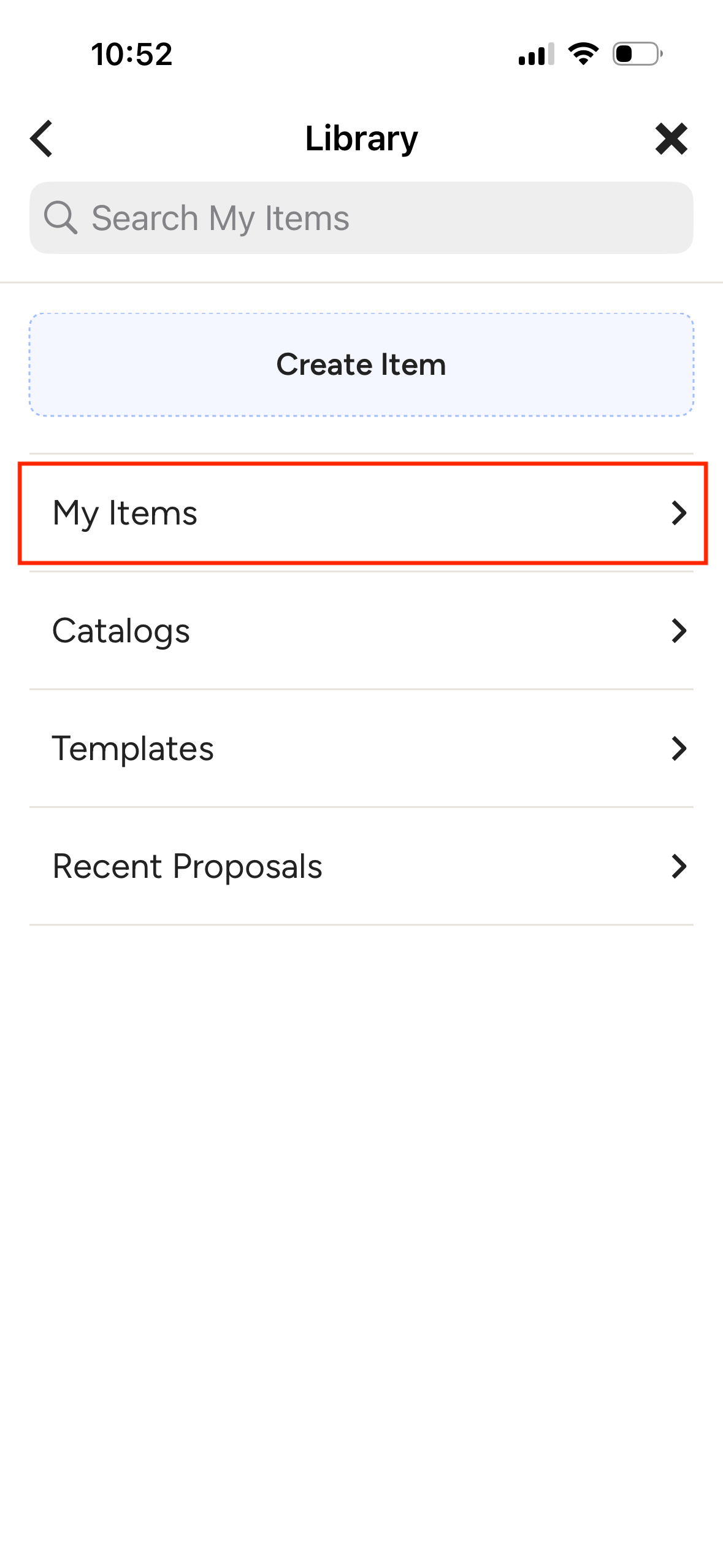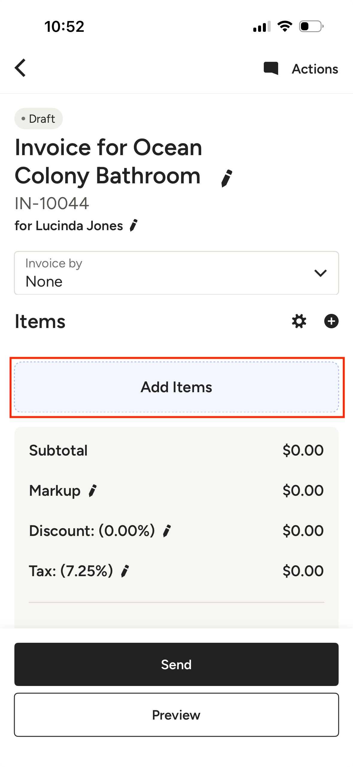Adding your clipped products to documents on the mobile app is simple. From within any estimate/proposal or invoice, tap Add Items.