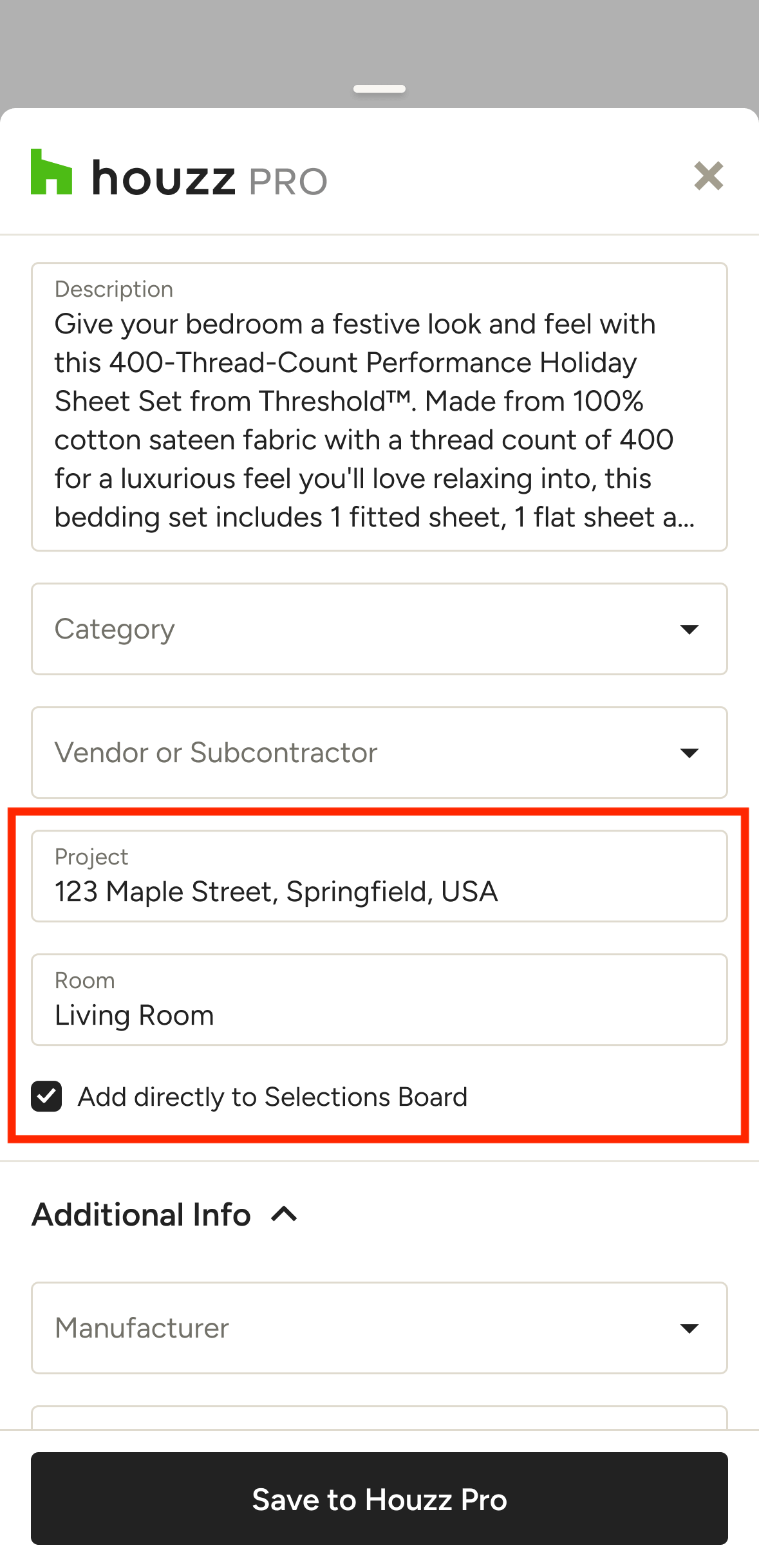 If you want to add the item to a specific project and/or selection board, make sure you scroll down and fill in the Project and Room, and mark the checkbox next to "Add directly to Selections Board.