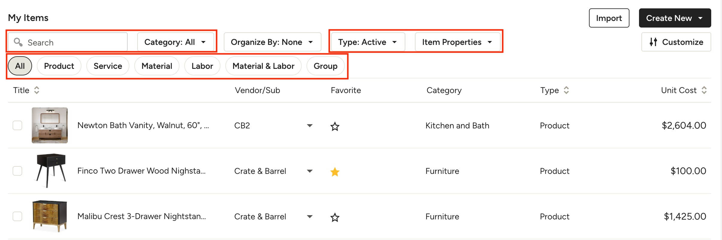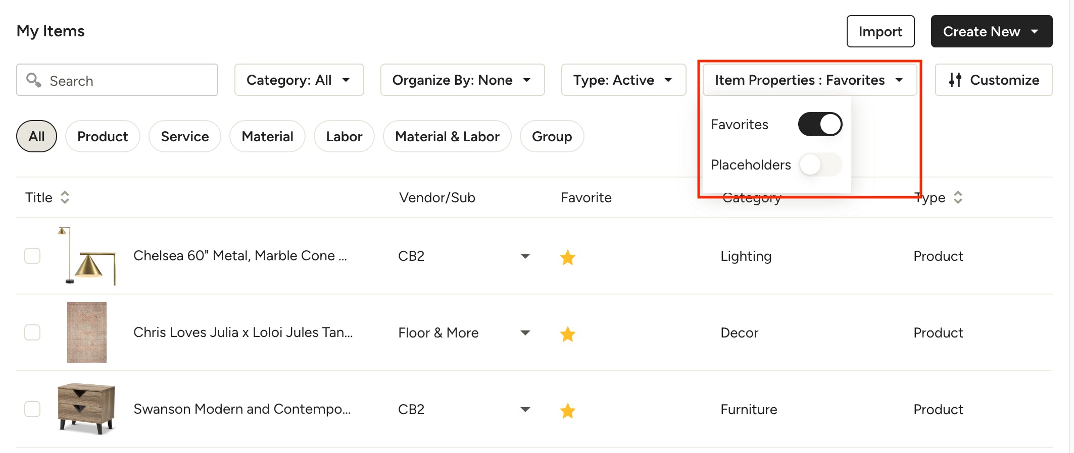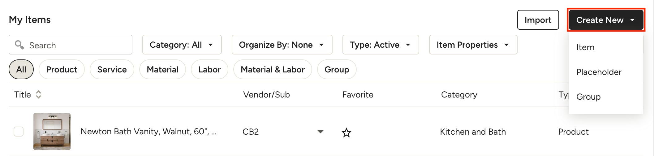 All Item types, including products, services, materials, labor, groups (designers) and assemblies (builders) will be available at the top of your My Items page to quickly filter by clicking the relevant item type. You can also use the search bar or filter by category to narrow down the items shown. Use the Type dropdown to select whether you want to show All, Active or Archived items, and the Item Properties dropdown to filter by Placeholders or Favorites.