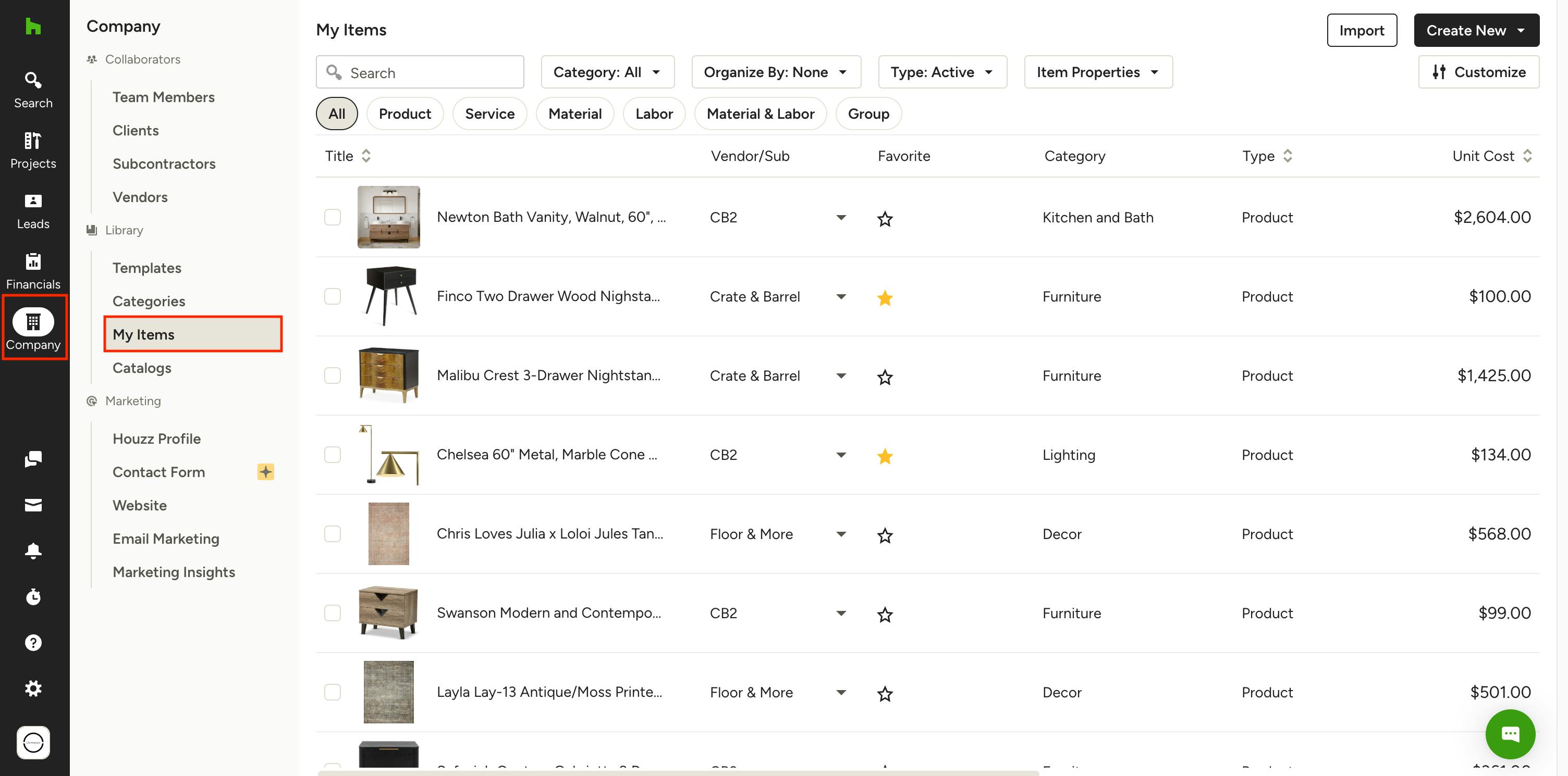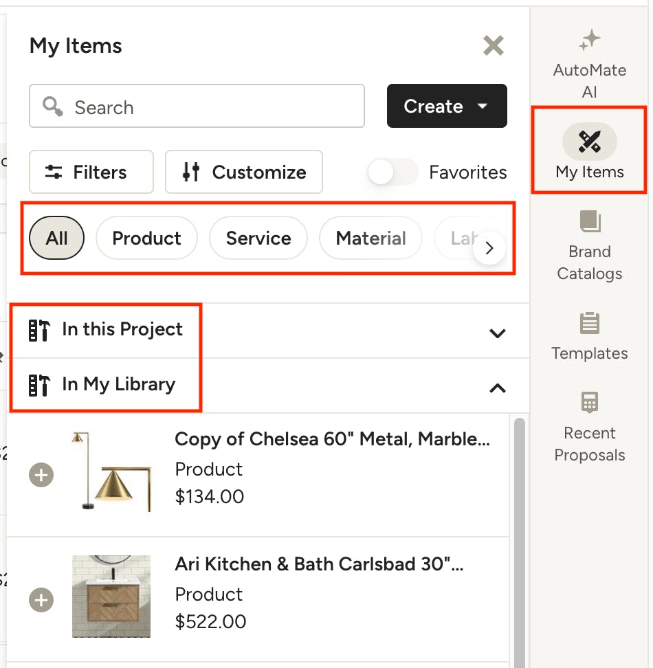 The Product Library, aka My Items, is a collection of all the items you plan to use or have saved on Houzz Pro. It makes it easy for you to quickly pull in item information, save it, and reuse it across projects as needed. Within your library you’ll find products, services, materials, labor, groups (designers), assemblies (builders) and placeholders — use it as a tool to keep your items updated and organized so you can quickly find and add items to documents and tools with ease.