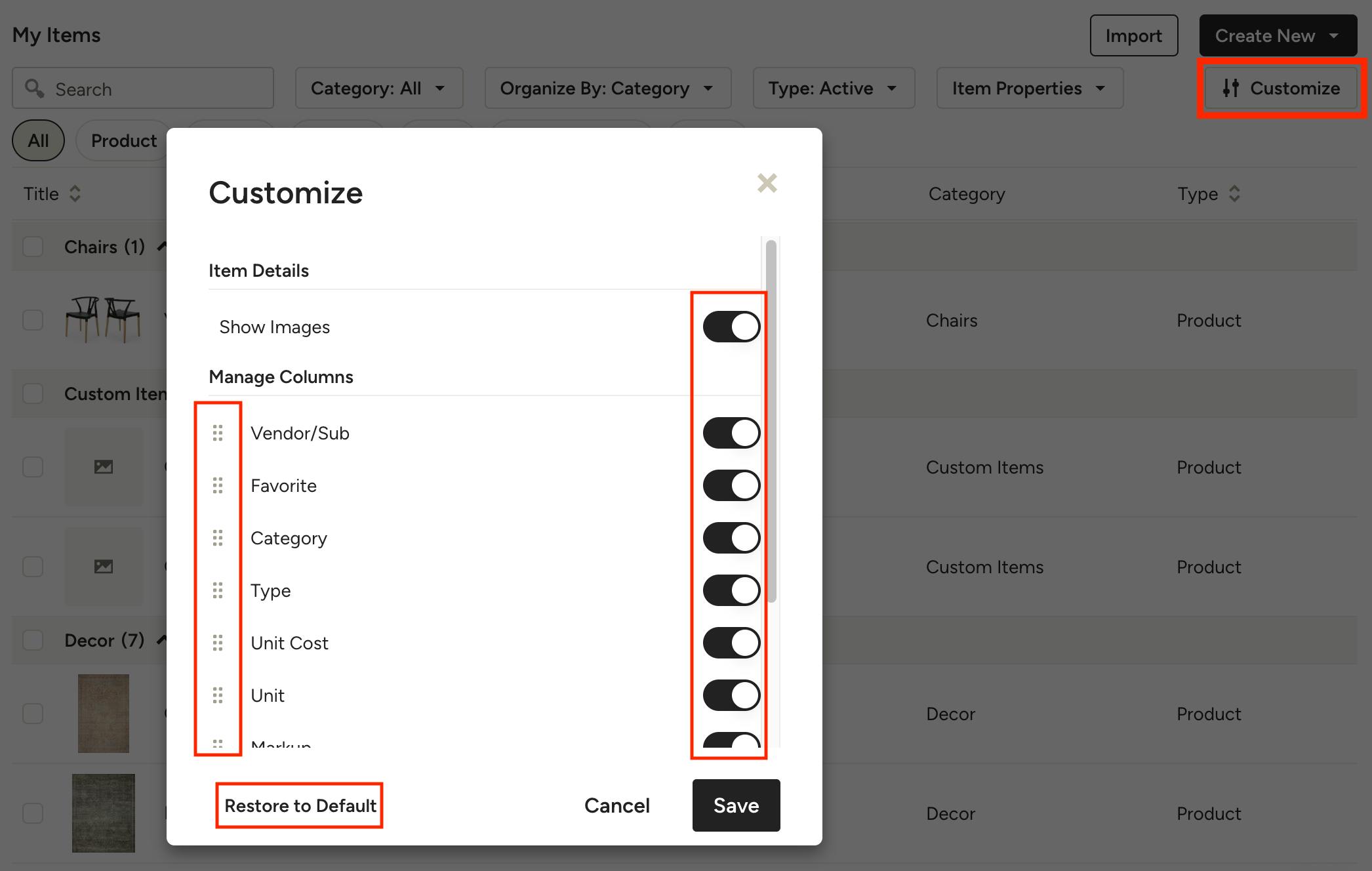 You can customize your column preferences on the My Items page by clicking the Customize button in the top right. In the Customize modal you can toggle on/off the columns you want to see as well as rearrange them by dragging them into place using the six dots to the left of each one. To hide images, toggle off Show Images under the Item Details section.