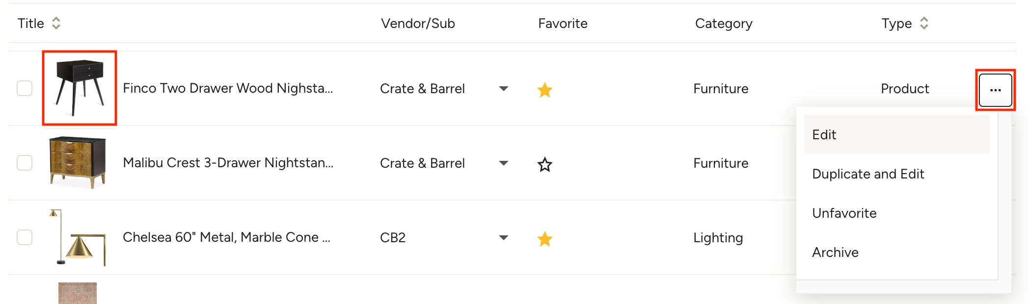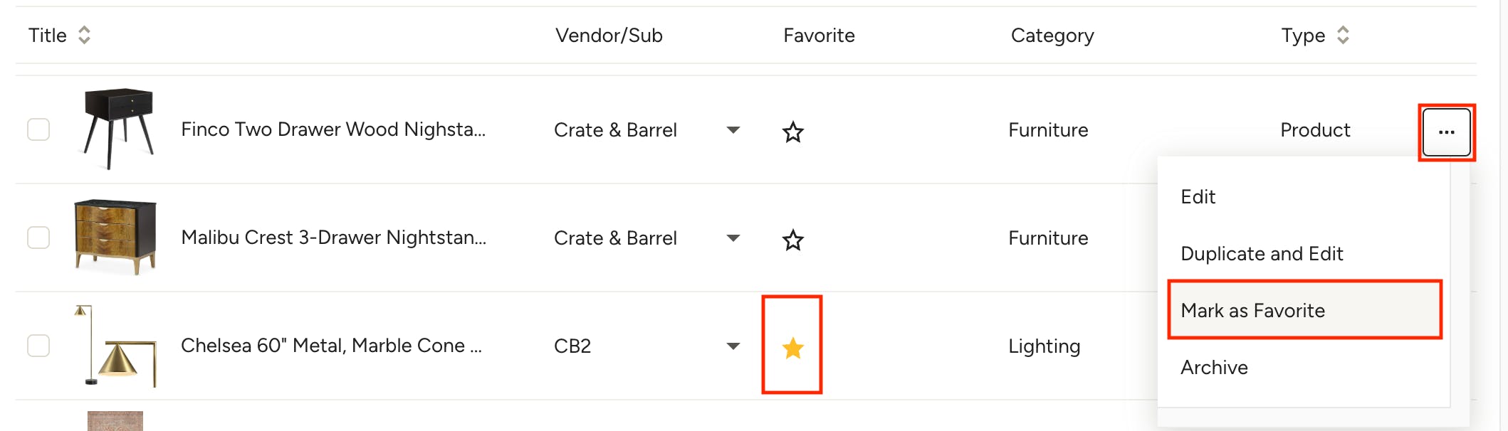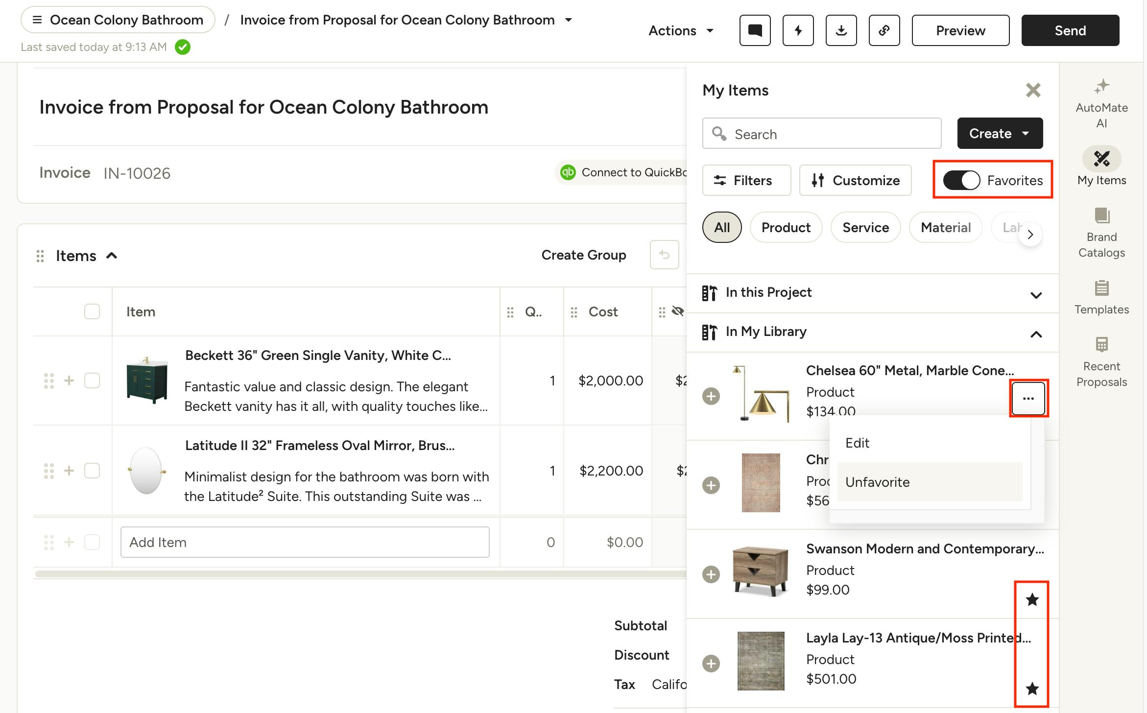You will see a similar experience when accessing My Items across the features in Houzz Pro — the Favorites toggle will be at the top of the item panel and you can quickly search or filter the results using the item filters. Favorites will be denoted by a star icon to the right of the item; you can unfavorite by clicking the three dots and selecting Unfavorite.