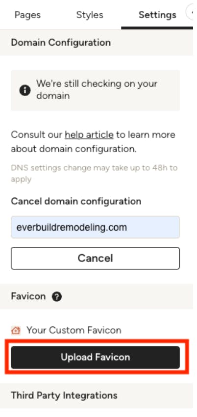 The Settings Tab is where you can connect your domain to get your site live, upload a favicon, connect to third party integrations, and a few other advanced settings.