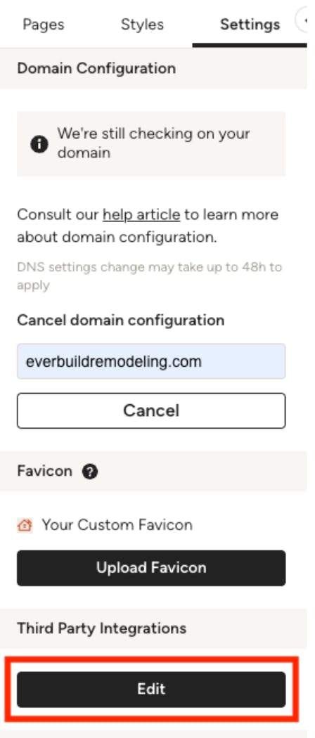 To do this, click the Edit button under Third Party Integrations to access fields where you can paste specific codes. Read How to Use Third Party Integrations with Your Houzz Website to learn more about the integration process.