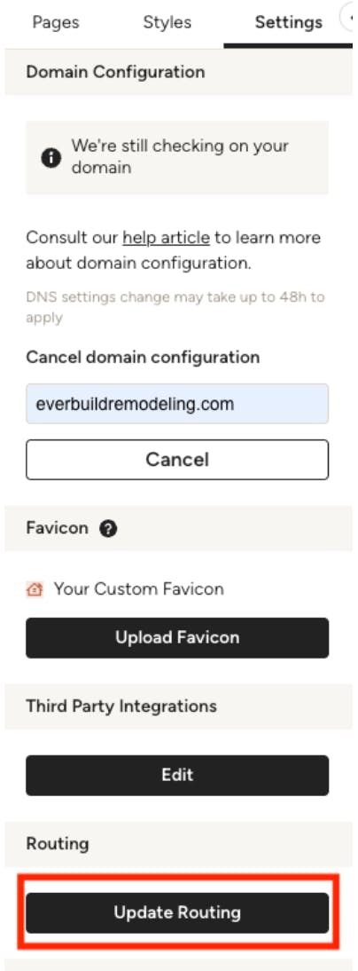 The Update Routing button allows you to customize the beginning part of your website's address (URL prefix) for your project pages and blog posts. If you have specific preferences for your URL structure, you can adjust them here.