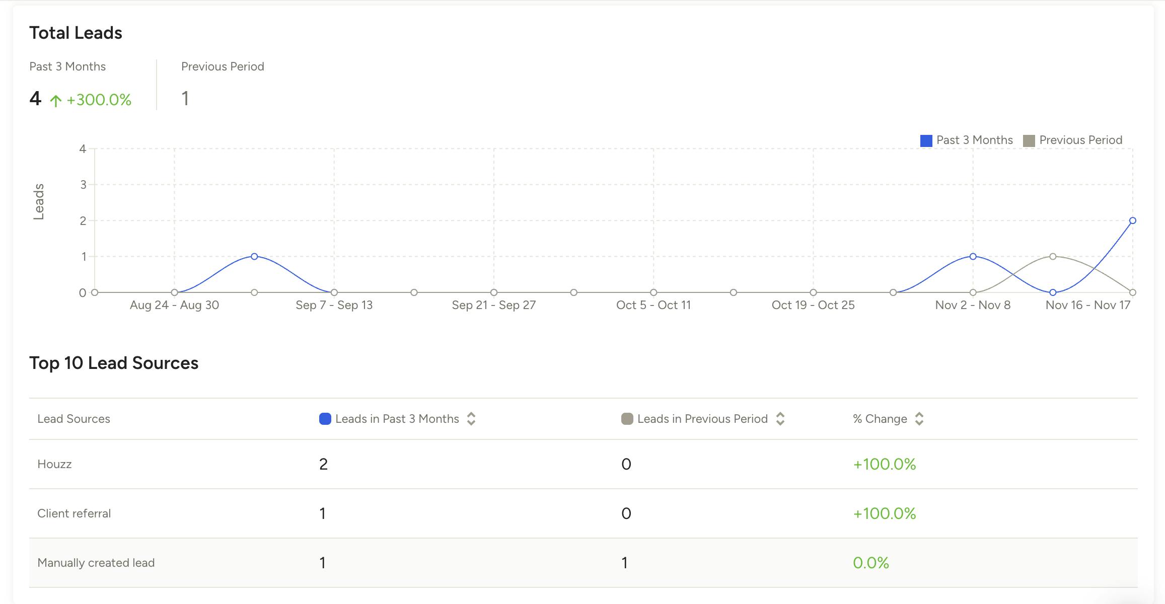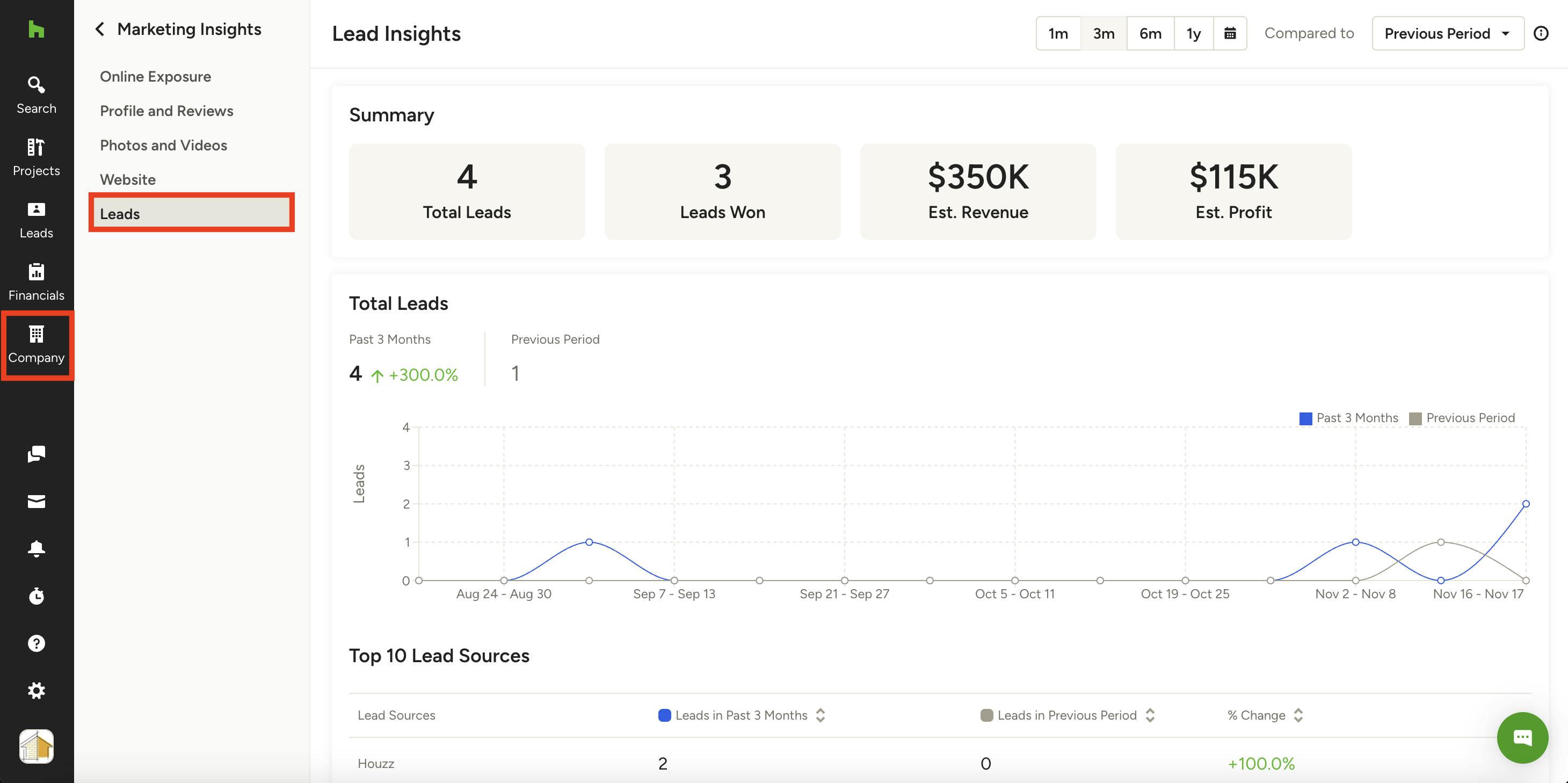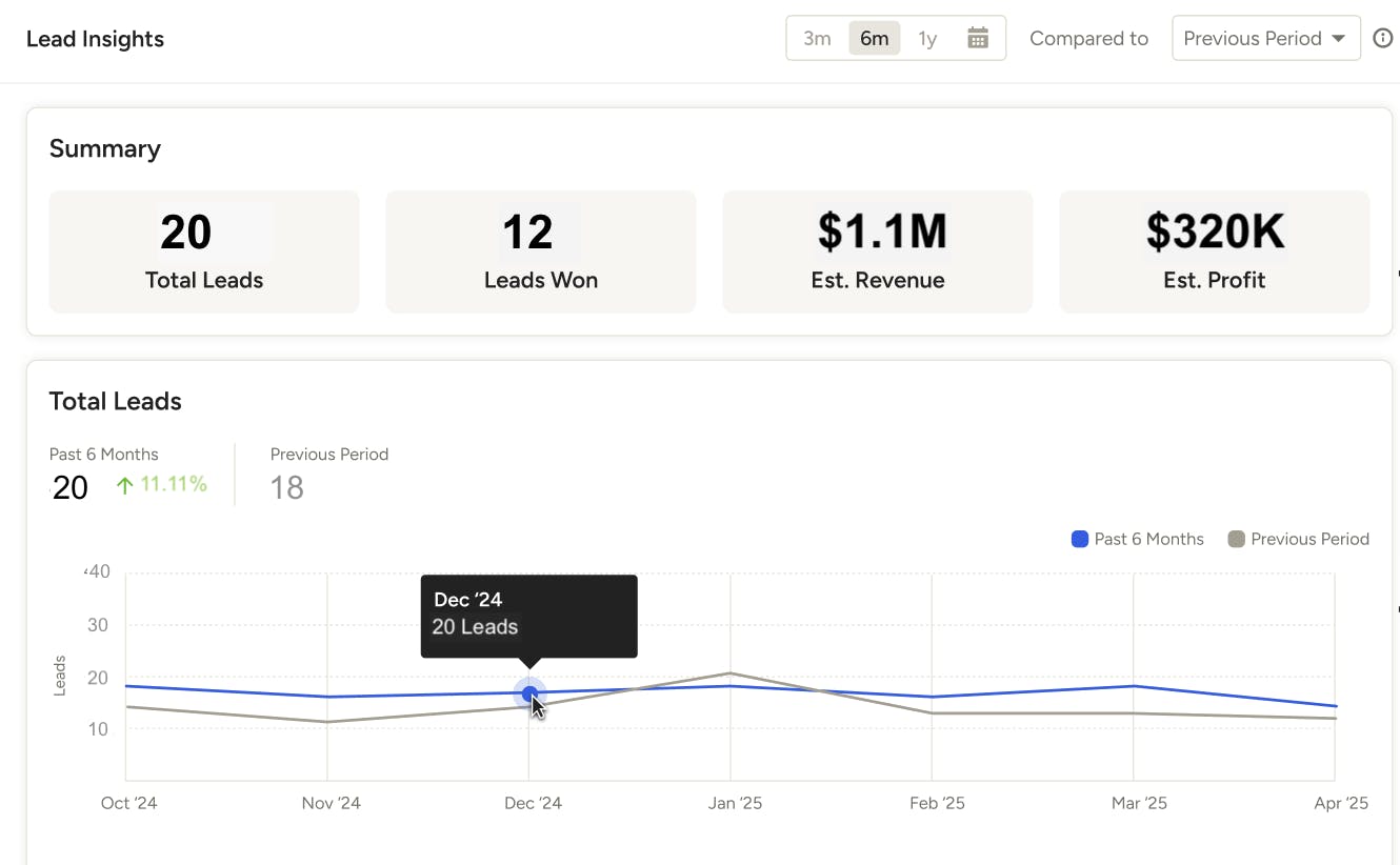 In this section, you can see how many leads you won, or converted to a project, during this time frame. It will also compare it to the previous year, if data is available.