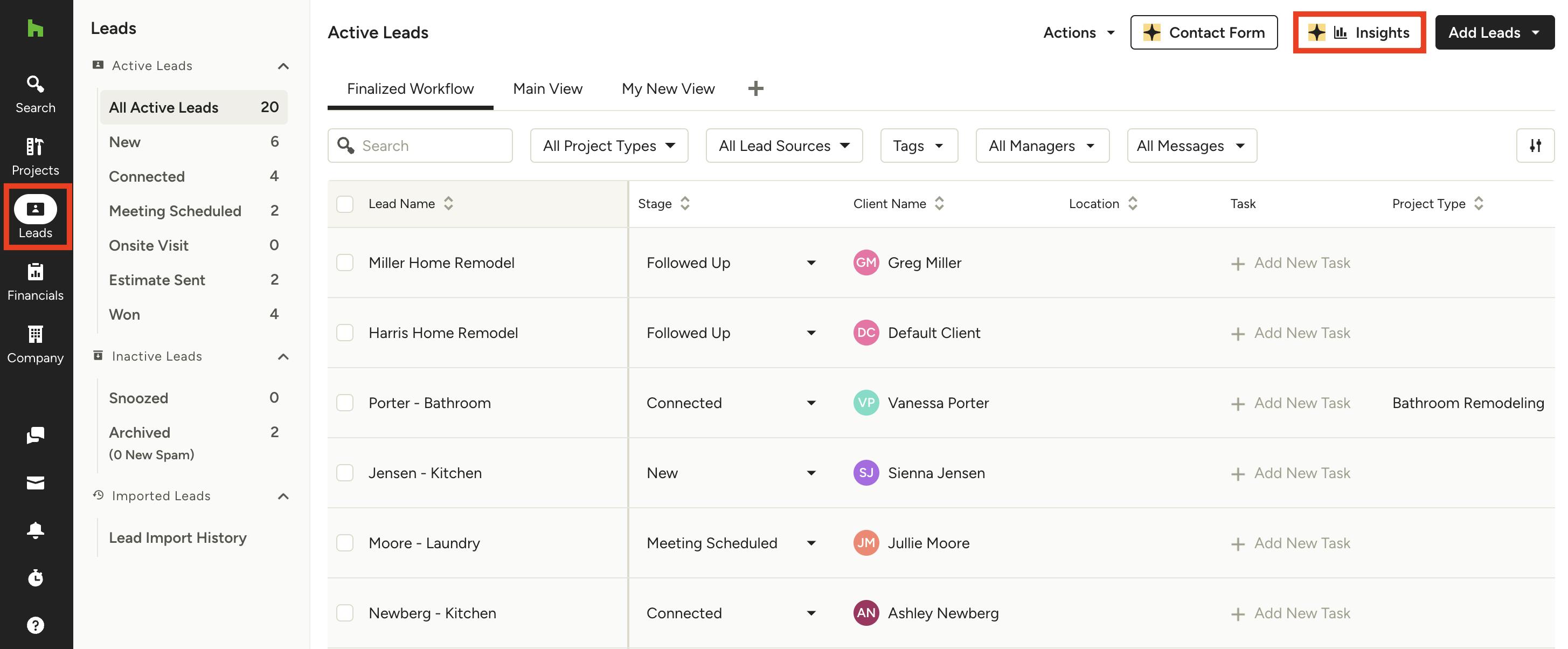 Converting a lead to a project is also key for accurate Lead Insights data. This will ensure your Leads Won section shows correct information.