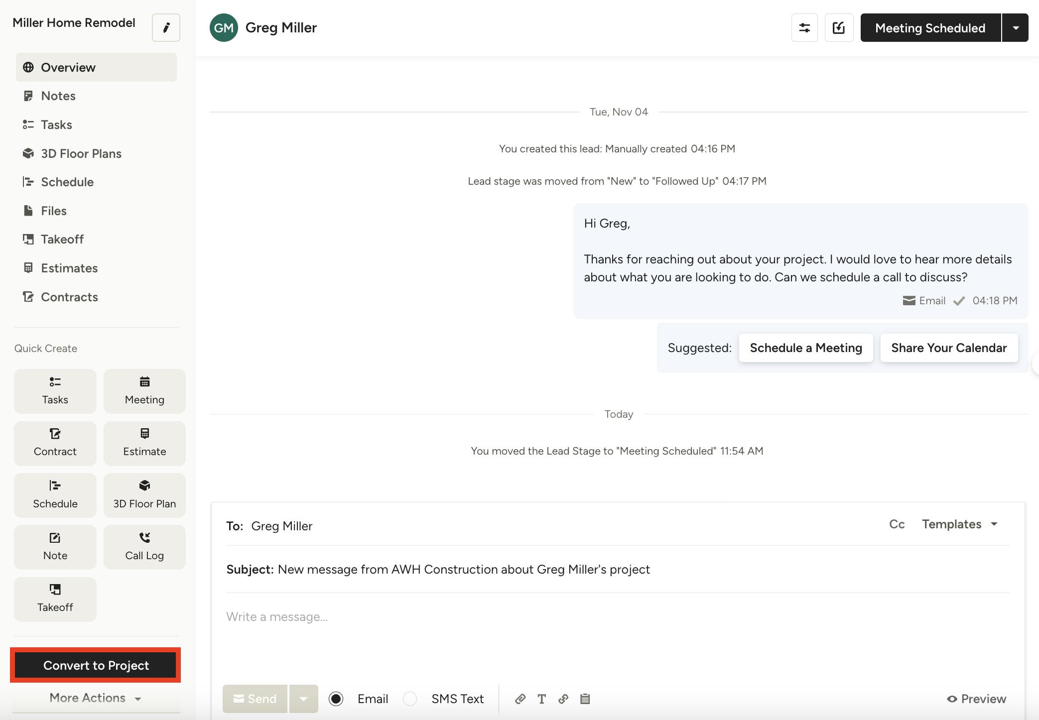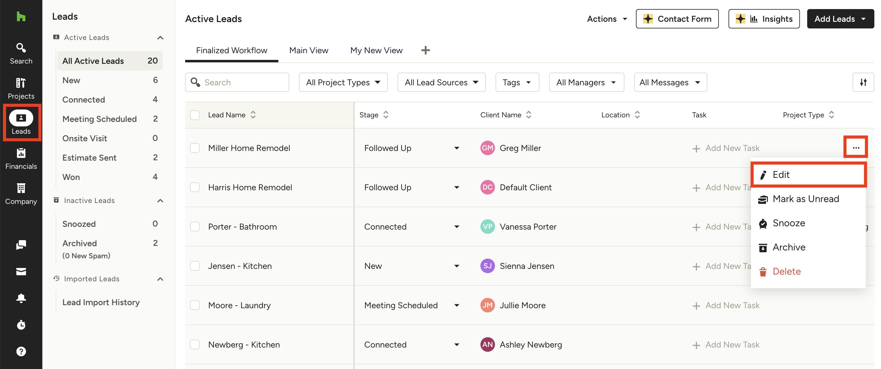 To make adjustments, click on the relevant lead in your All Leads list, then select the Convert to Project button on the left side of your screen.