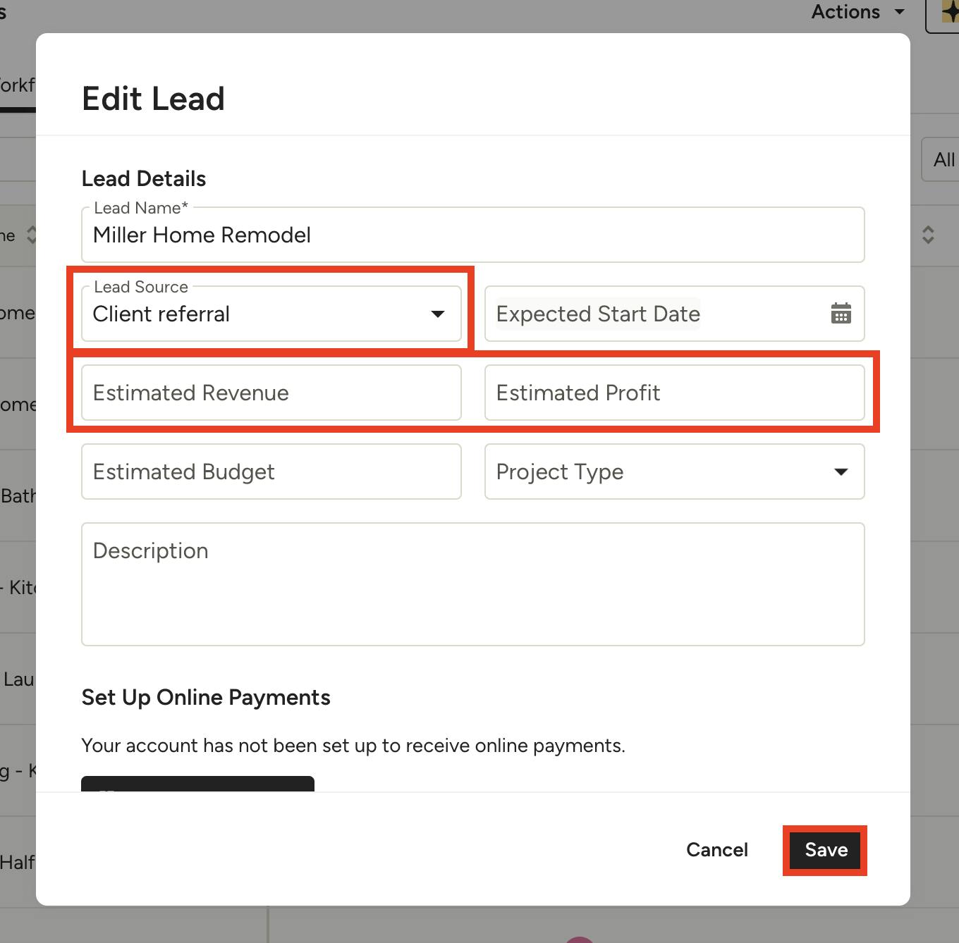 Be sure to click Save once complete. These updates will now properly reflect in the profit, revenue, and lead source data found on your Lead Insights page.