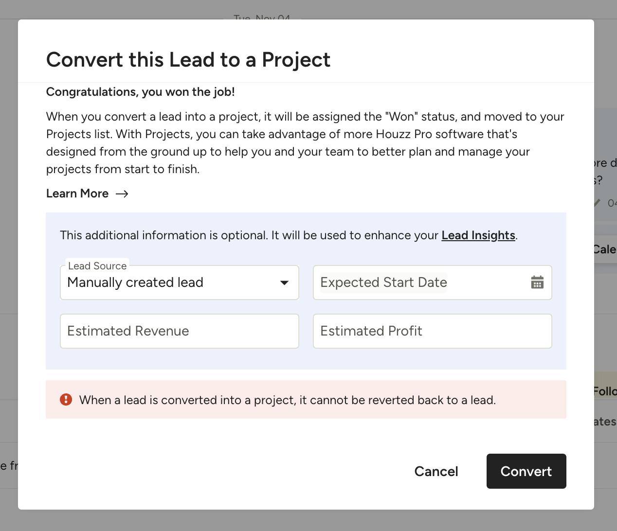 Be sure to click Convert once complete. This lead to project conversion will now properly reflect in the leads won data found on your Lead Insights page.