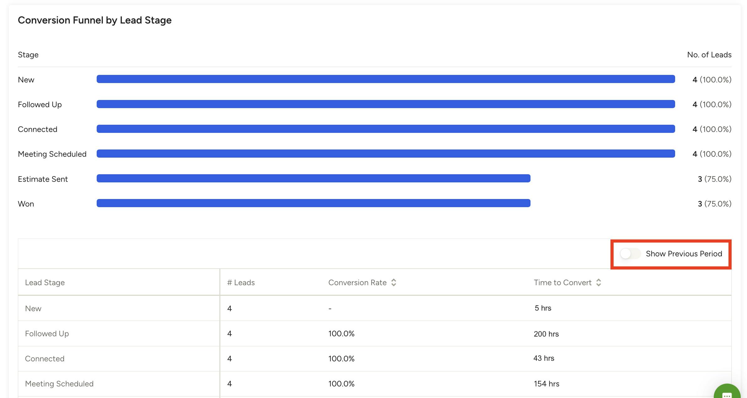 In the example below, 4 of the new leads made it to a scheduled meeting, but you only sent an estimate to 3 of the leads.