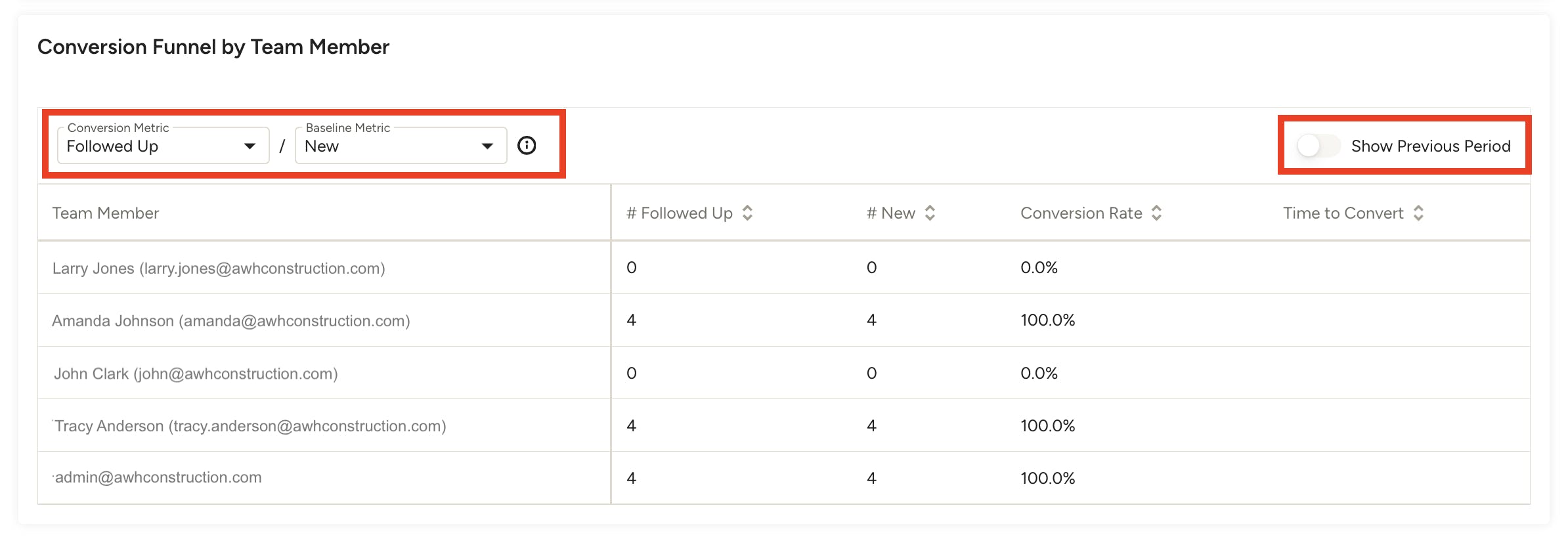For Example: If you would like to see how many leads converted to projects after a team member followed up, select Won in the conversion metrics dropdown, then select Followed Up in the baseline metrics dropdown. This will help you see which specific team members have followed up on leads that have then turned into a paying project.