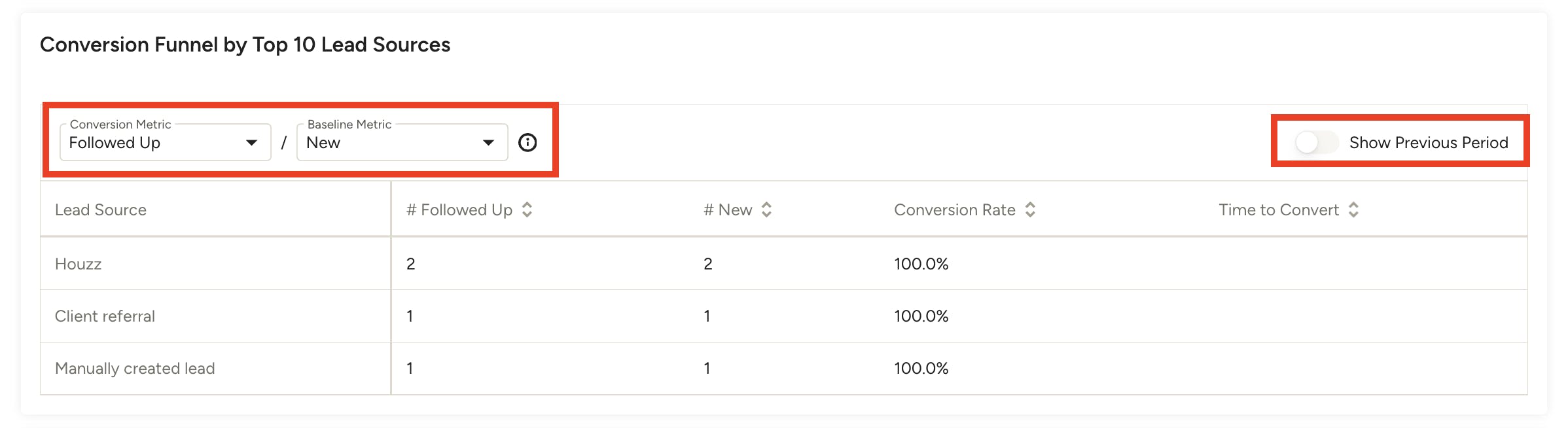 In this section, you can see the conversion rate details by specific lead source. Use the filters at the top of the table to adjust the conversion metrics and baseline metrics that you would like to compare.