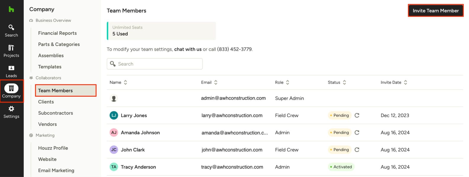 You can manage your current team members and invite new team members. Go to ‘Company’ in the Main Menu, and then select ‘Team Members’ as seen below. Within your team member page, you can manage your team members permissions and project access, and add a new team member by clicking Invite Team Member at the top right of your screen.
