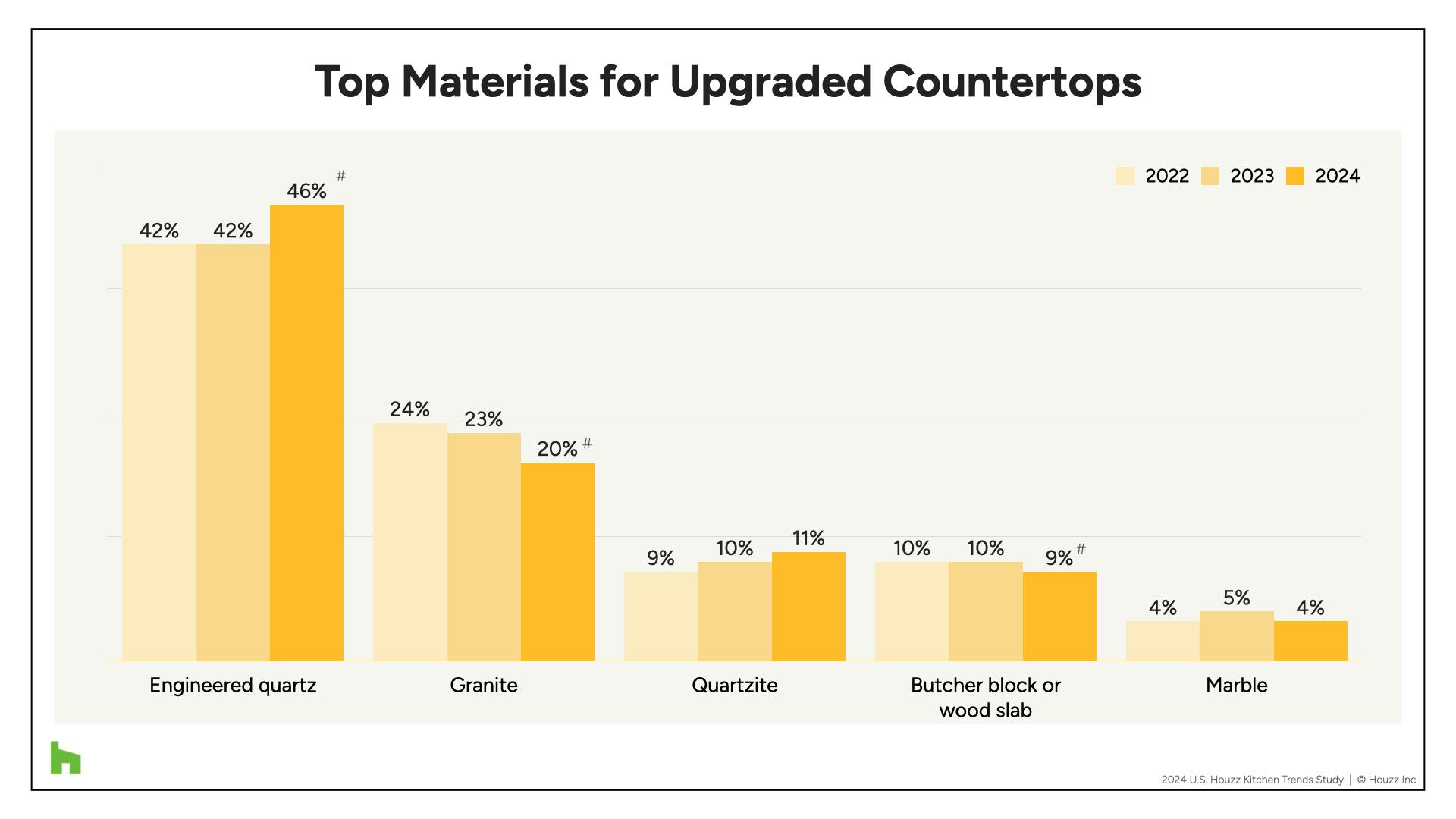 Given the uptick in cabinetmaker hiring, it’s not surprising that the preference for custom and semi-custom cabinets has risen as well. Among homeowners renovating their kitchens in 2024, 35% are opting for semi-custom cabinets, versus 31% in 2023, and 45% are going for fully custom cabinets, versus 44% in 2023. The share choosing stock cabinets has dropped by 4%.