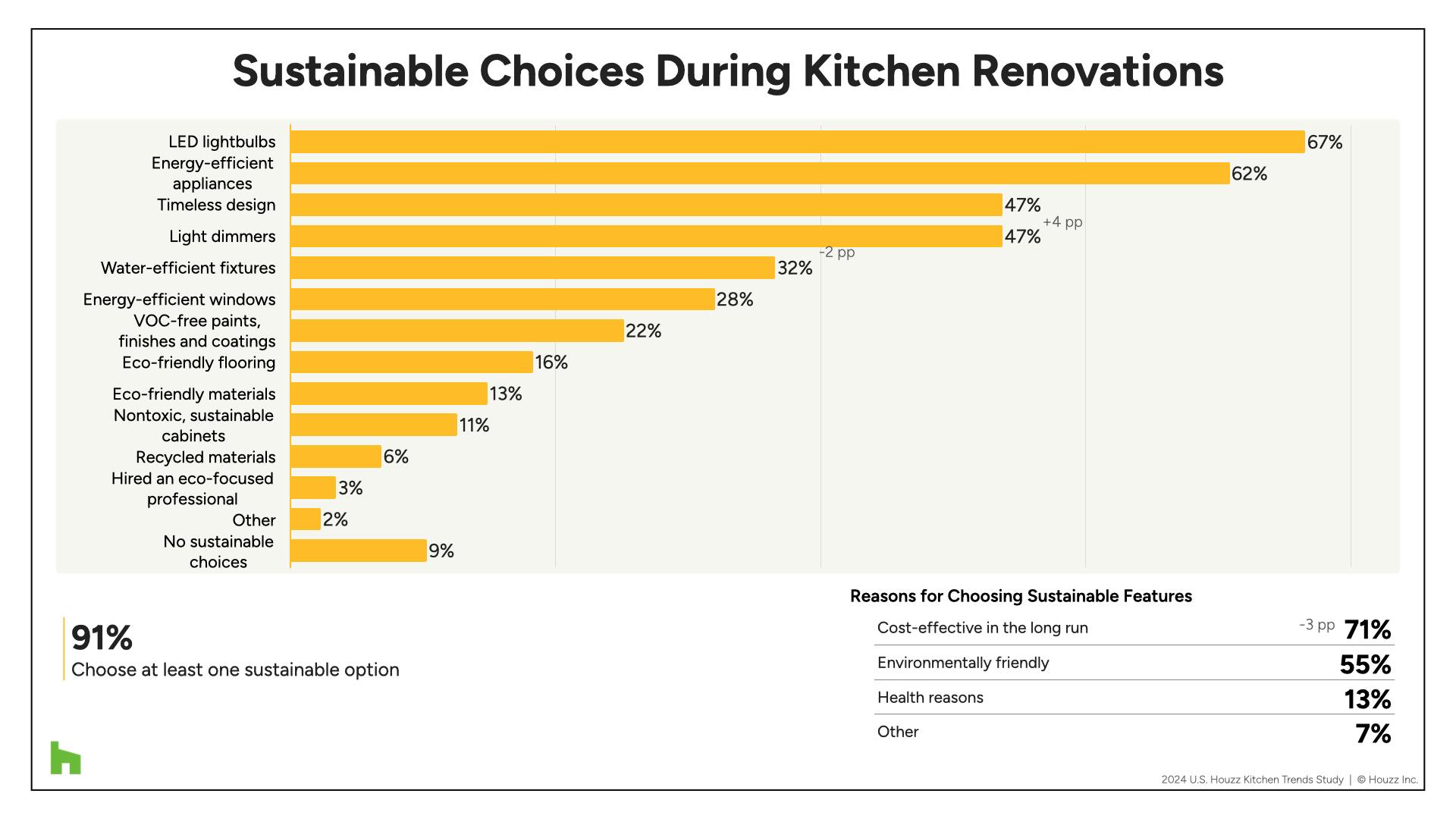 The top reason for incorporating sustainable choices is that they’re cost-effective in the long run (71%), but 55% do so for environmental friendliness. In fact, 3% of renovating homeowners have hired or are hiring an eco-focused professional in 2024.