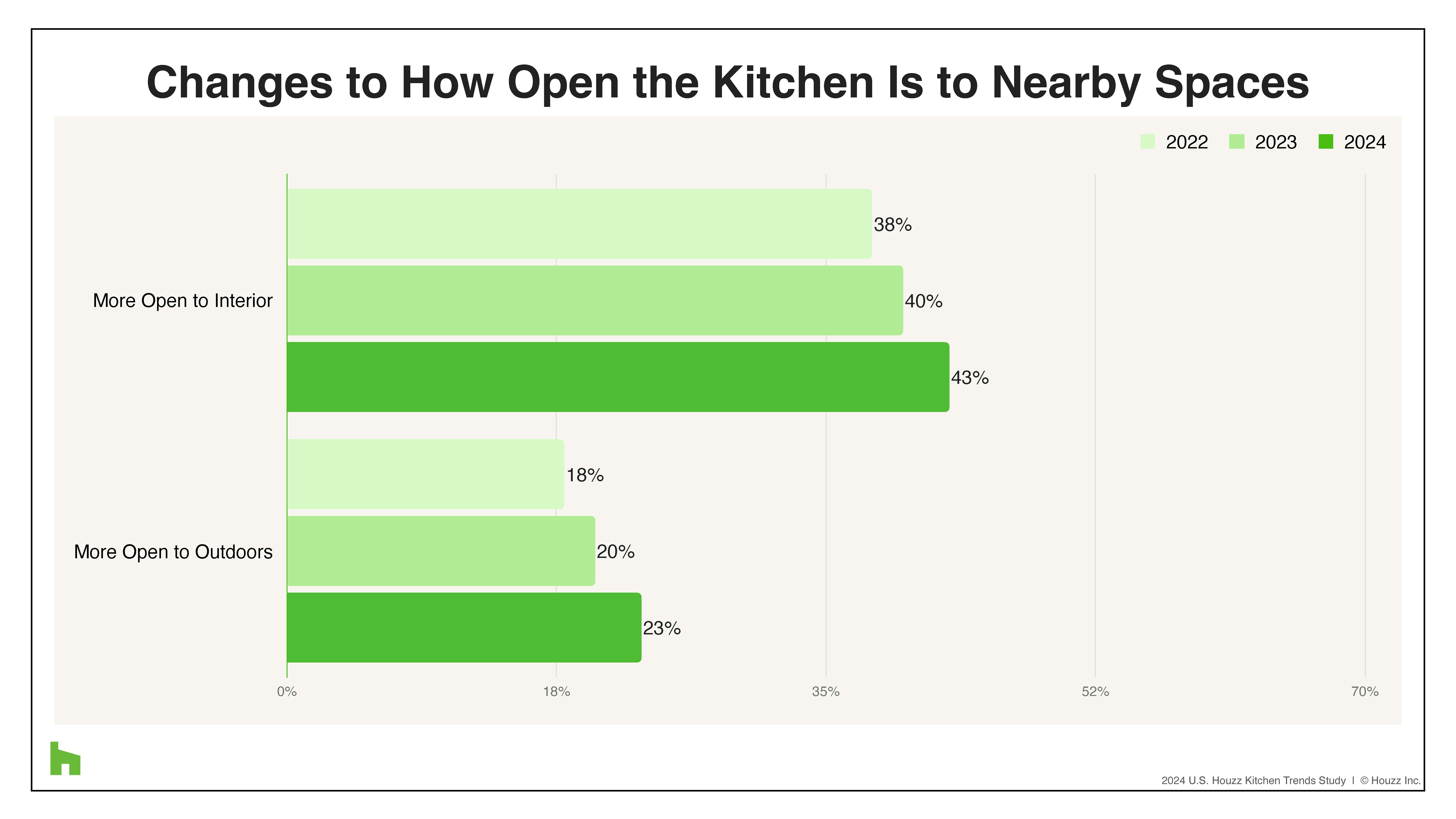 Creating separation naturally became more popular during the COVID pandemic, with only 38% of homeowners opening up their kitchens to other interior spaces in 2022 versus 53% in 2019. But now we’re seeing a gradual shift back to the open concept: 40% of homeowners went this route in 2023, and 43% are doing or planning to do so in 2024.