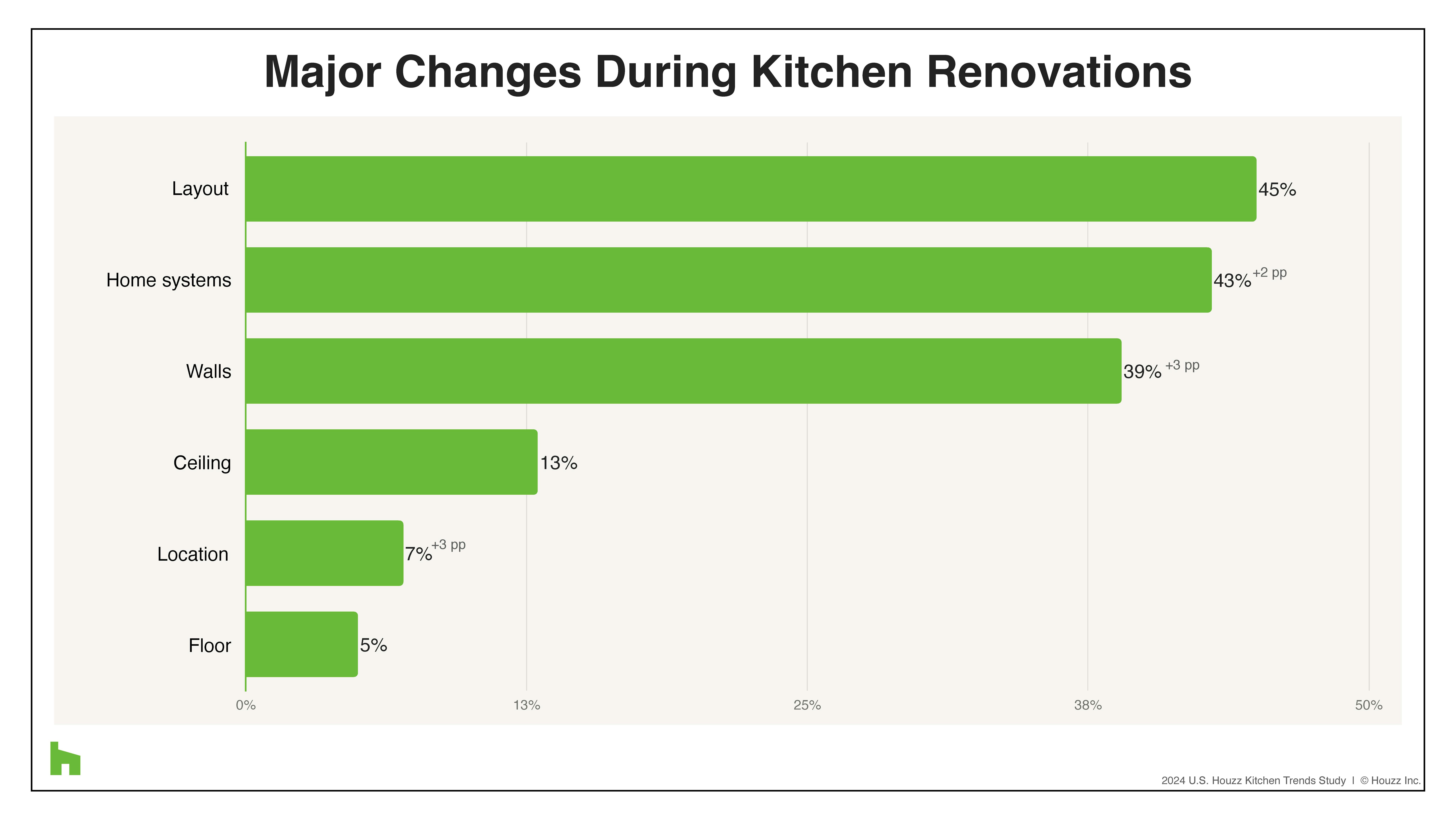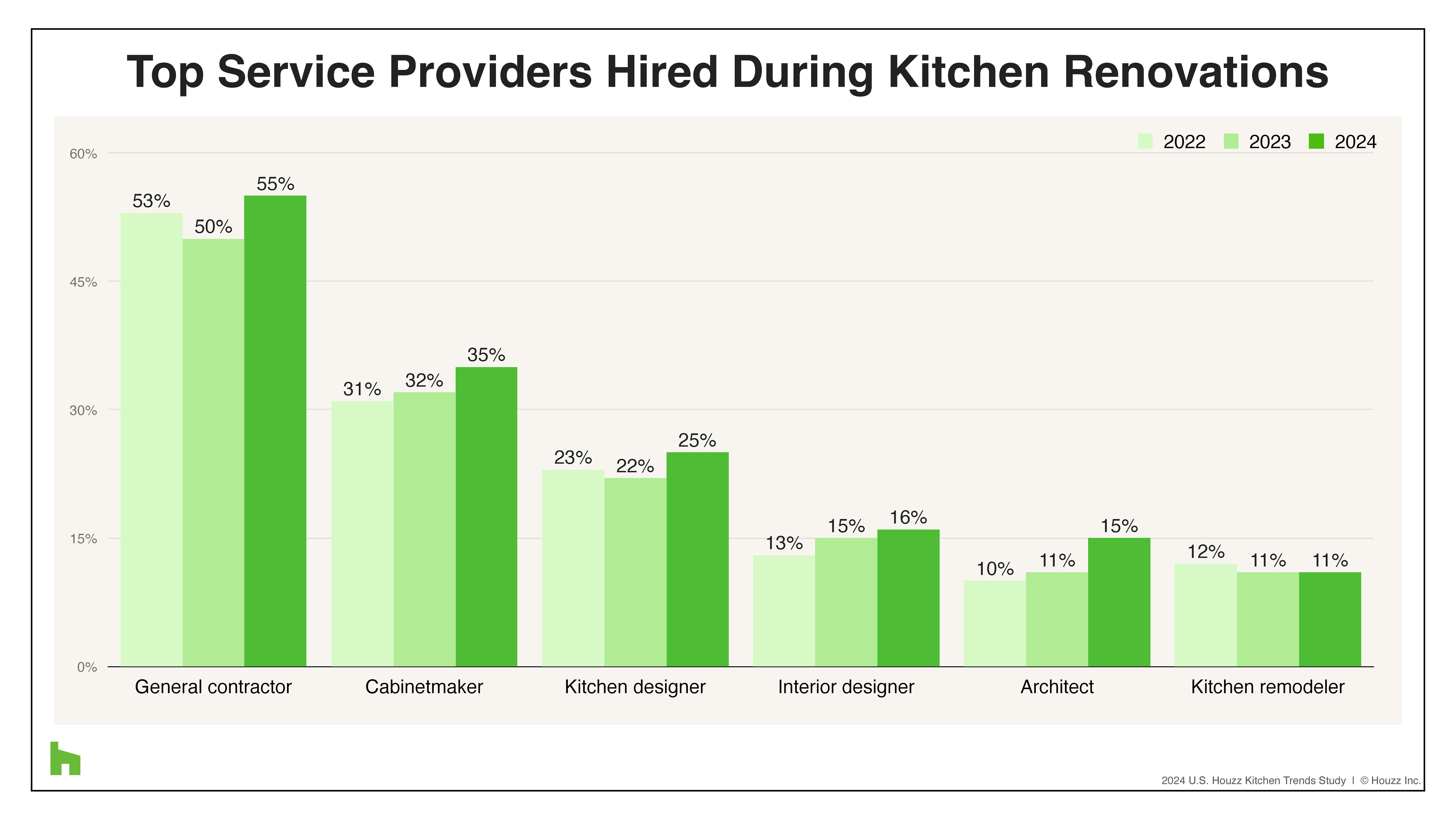 Another reason certain service providers are being hired more frequently is likely the increase in frequency of complex projects. For instance, the percentage of renovating homeowners who are modifying kitchen walls (39%) and completely changing the kitchen’s location (7%) grew by 3 points each year over year. Additionally, 45% of homeowners are changing the kitchen’s layout and 43% are changing kitchen systems. The latter share is up by 2 percentage points.