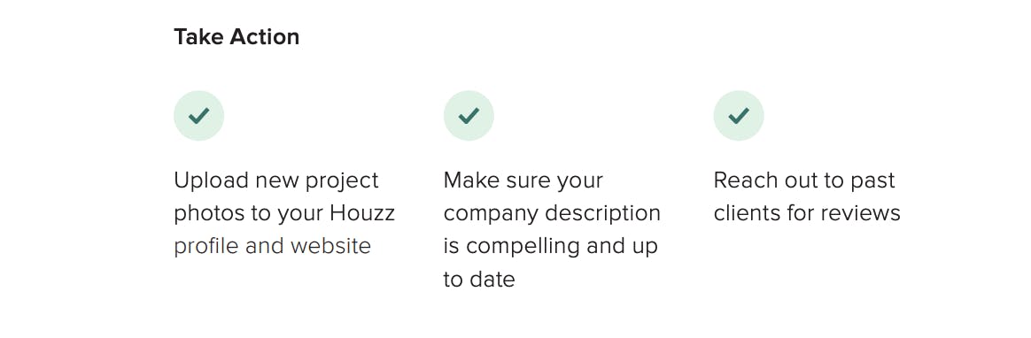 Houzz Pro members can get a dedicated client success manager who can assist in keeping your profile updated, creating a strong profile description, and requesting reviews. Our client success managers are here to make sure your inbound marketing through Houzz is taken care of for you.