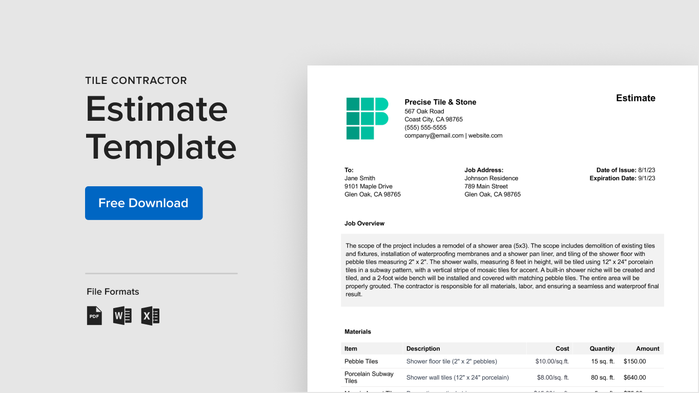 In this article, we provide a free flooring estimate template for Excel and Word to guide you through creating some of your first estimates and include a flooring estimate example for inspiration. The downloadable flooring estimate template makes it easy to print and email your completed estimate when you are done. And, because the flooring estimate template is fully customizable, you can edit it to fit your business and needs.