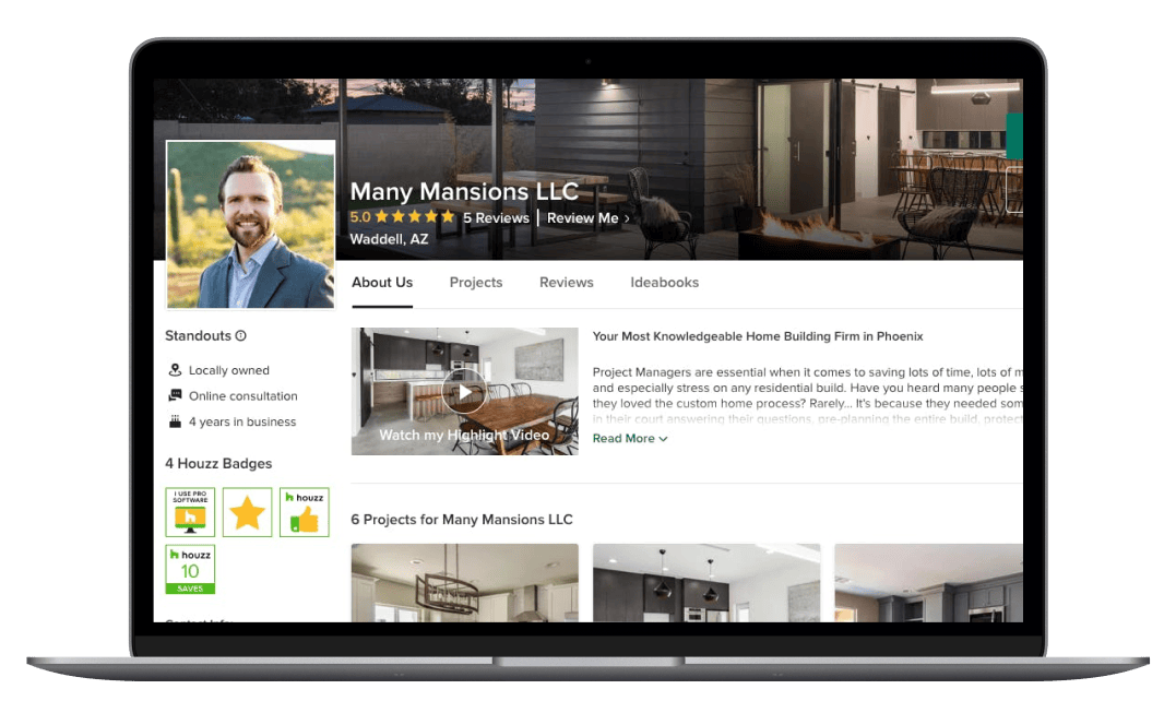 The Houzz Pro team also built the Many Mansions website, says Bryan, “I used Houzz Pro to build my website and that’s saved me a lot of money. It's super important to have a professional front for clients to see before they talk to you. And Houzz is a platform that my clients already use and trust.”