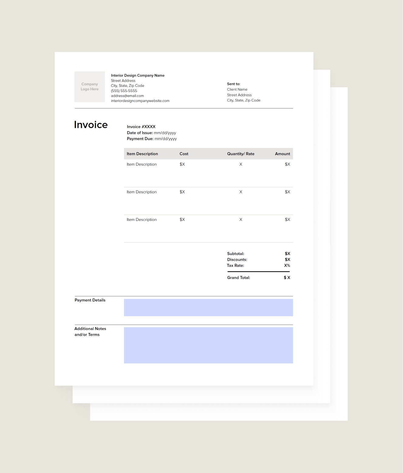Make sure to include a high-resolution version of your business logo prominently in your interior design invoice template for a professionally branded touch. The top left, top right, or bottom centered portions of your invoice are common areas to add your logo.