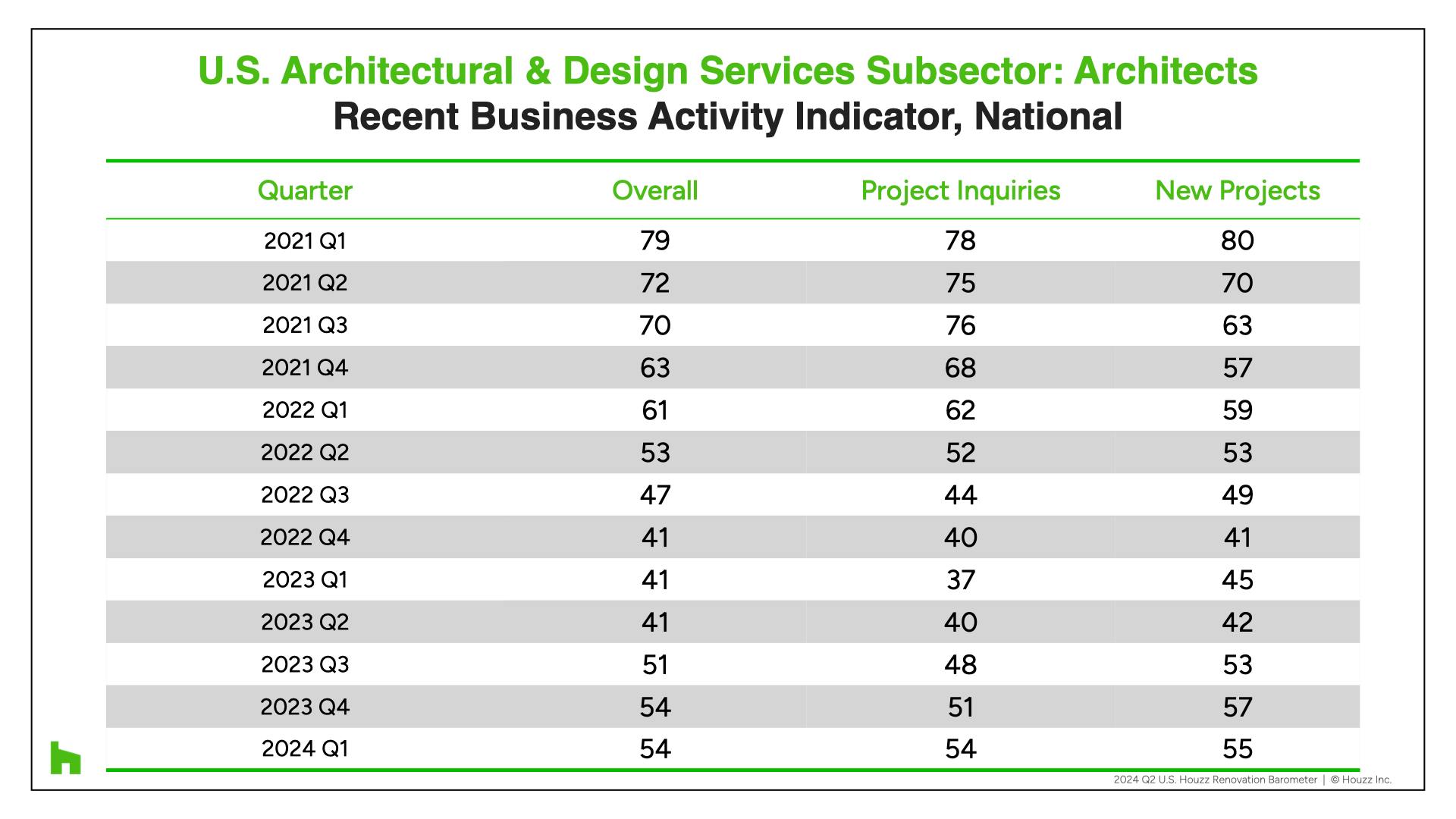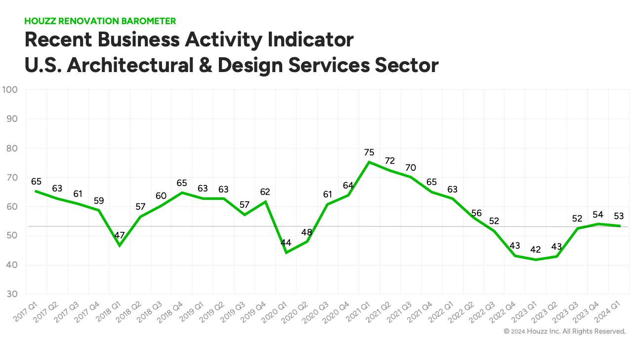 The Recent Business Activity Indicator, which tracks project inquiries and new committed projects, has been above 50 for the third consecutive quarter, as of Q1 2024. (A score above 50 indicates that more businesses saw a quarter-over-quarter increase in business activity than saw a quarter-over-quarter decrease.) The score also was higher in those three quarters than in the three quarters preceding them, which means that designers and architects have seen improvements year over year.