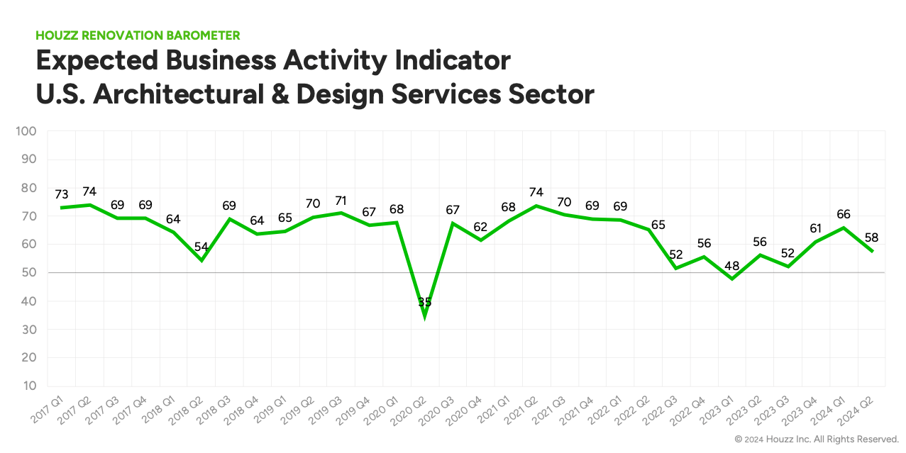 Every quarter, we share insights from the Houzz Renovation Barometer to help you stay abreast of industry trends and make better business decisions. The Barometer provides insights on business expectations, project backlogs and recent activity among businesses in the U.S. construction and architectural and design services sectors, related to residential projects. Here are the findings for the second quarter of 2024 specifically for interior designers and architects.