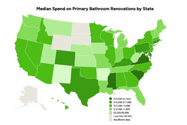 While the median spend on primary bathroom remodels nationwide has grown by 50% year over year, increasing from $9,000 in 2021 to $13,500 in 2022, median spend varies widely by state. At the top end of the range are Virginia ($20,000), South Carolina ($18,500) and Rhode Island ($18,500). At the lower end are Arkansas ($2,700) and New Mexico ($5,000), followed by Montana and West Virginia ($6,000 each). California, New York, Georgia, and several other states came in with a median spend at $15,000 each, while Vermont, Louisiana, Indiana and several other states hover at the $10,000 mark.