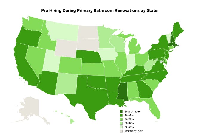 Among the survey respondents, more than 95% of those from Rhode Island hired a pro for their primary bathroom renovation. Massachusetts isn’t far behind (93%), and New Hampshire is just below that (91%), meaning the top three states for pro hiring are on the East Coast. Texas matched the nationwide average hiring rate for primary bathroom renovations of 86% exactly. Remodeling pros in those areas were likely seeing an uptick in bathroom remodeling leads.
