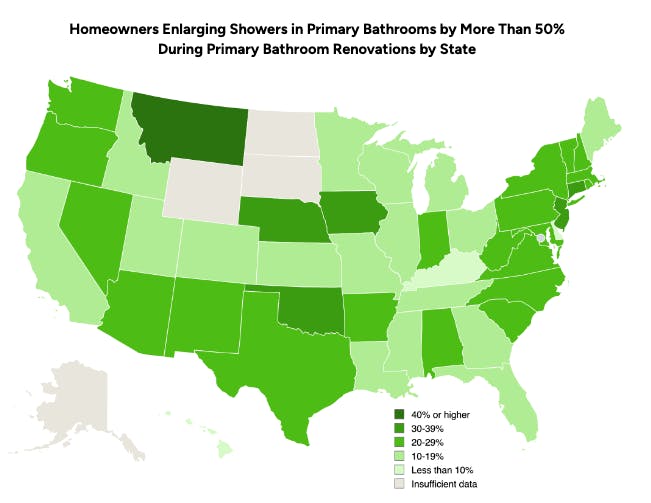 The nationwide share of those increasing the size of their shower (20%, as noted above) roughly correlates with the share of those who increase the size of their bathroom (22%). But by state, the shares don’t necessarily line up. For instance, Kansas has the highest percentage of baths greater than 200 square feet after a renovation (40%), but only 18% of showers in that state, on average, grew by 50% or more. And while Mississippi has the highest percentage of significantly expanded showers after a renovation (44%), it has one of the lowest percentages of bathrooms bigger than 200 square feet (8%).