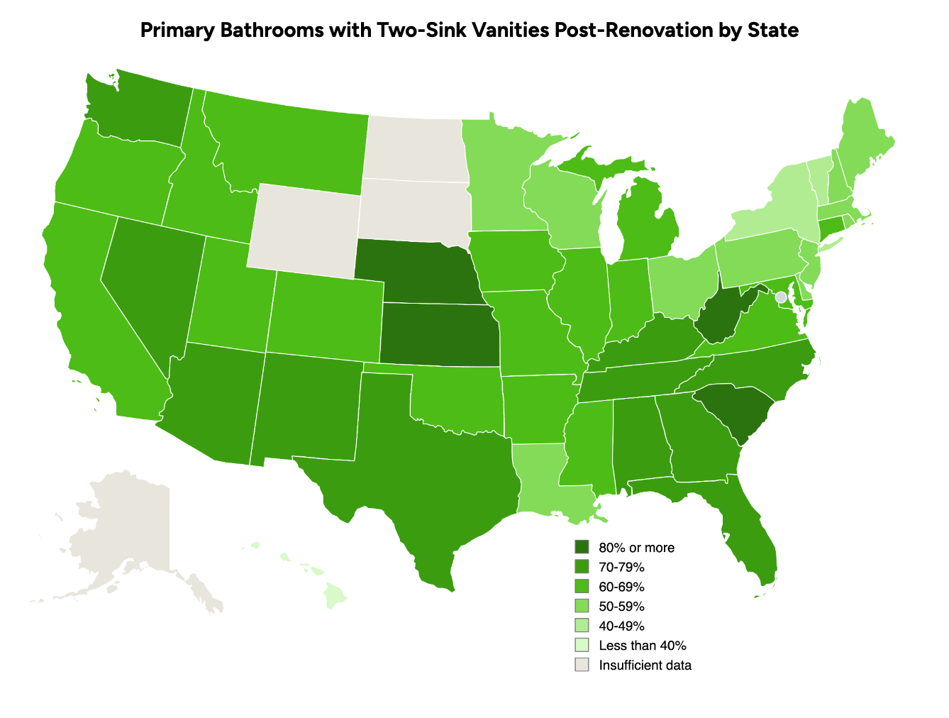 Nearly 2 in 3 homeowners nationwide (65%) choose to install double-sink bathroom vanities during a primary bathroom renovation. In four states, at least 4 in 5 on average opt for double sinks: West Virginia, 88%; Nebraska, 85%, Kansas, 85%; South Carolina 83%; Arizona, 79%; and Tennessee 78%. And in nine states, at least 70% do: North Carolina, 75%; Texas, 74%; Kentucky, 74%; Nevada, 73%; New Mexico, 73%; Florida 72%; Alabama 71%; Georgia, 71% and Washington 71%.